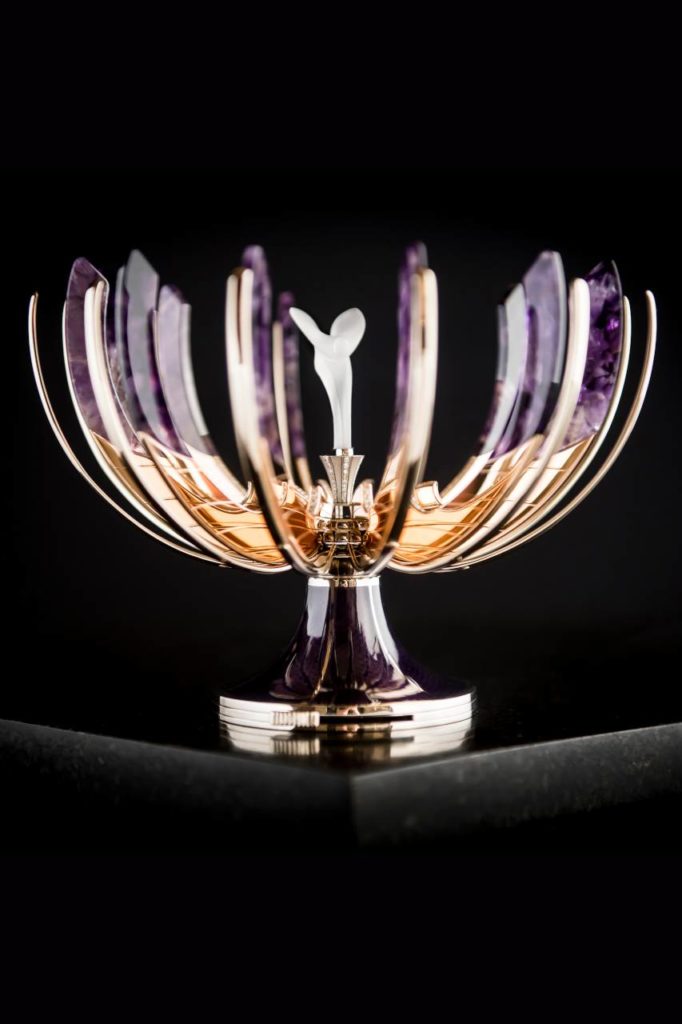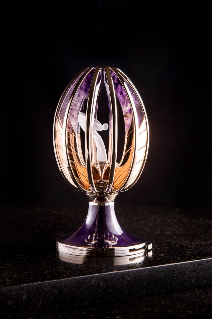 Un incontro tra due mondi, frutto tanto della tradizione quanto delle più avanzate tecniche di oreficeria. Alto 160mm e dal peso di 400g, l’Uovo riposa su una base d’oro bianco 18 carati finemente decorata a mano. Il “guscio” è costituito da braccia in oro rosa - impreziosite da decorazioni in diamante e ametista - che, attraverso un meccanismo interno posto alla base, si schiudono rivelandone il contenuto: una riproduzione in cristallo di rocca smerigliato e scolpita a mano dello “Spirito dell’Estasi”, la musa ufficiale della casa automobilistica. Questo meccanismo, ritenuto il più complesso mai creato per un Uovo Fabergé, unisce la tradizionale arte orafa con le più moderne tecniche di micro ingegneria e di CAD (progettazione assistita dall’elaboratore grafico) per creare un’opera d’arte senza eguali. Una dimostrazione della reputazione di eccellenza che il marchio Fabergé possiede ancora oggi.