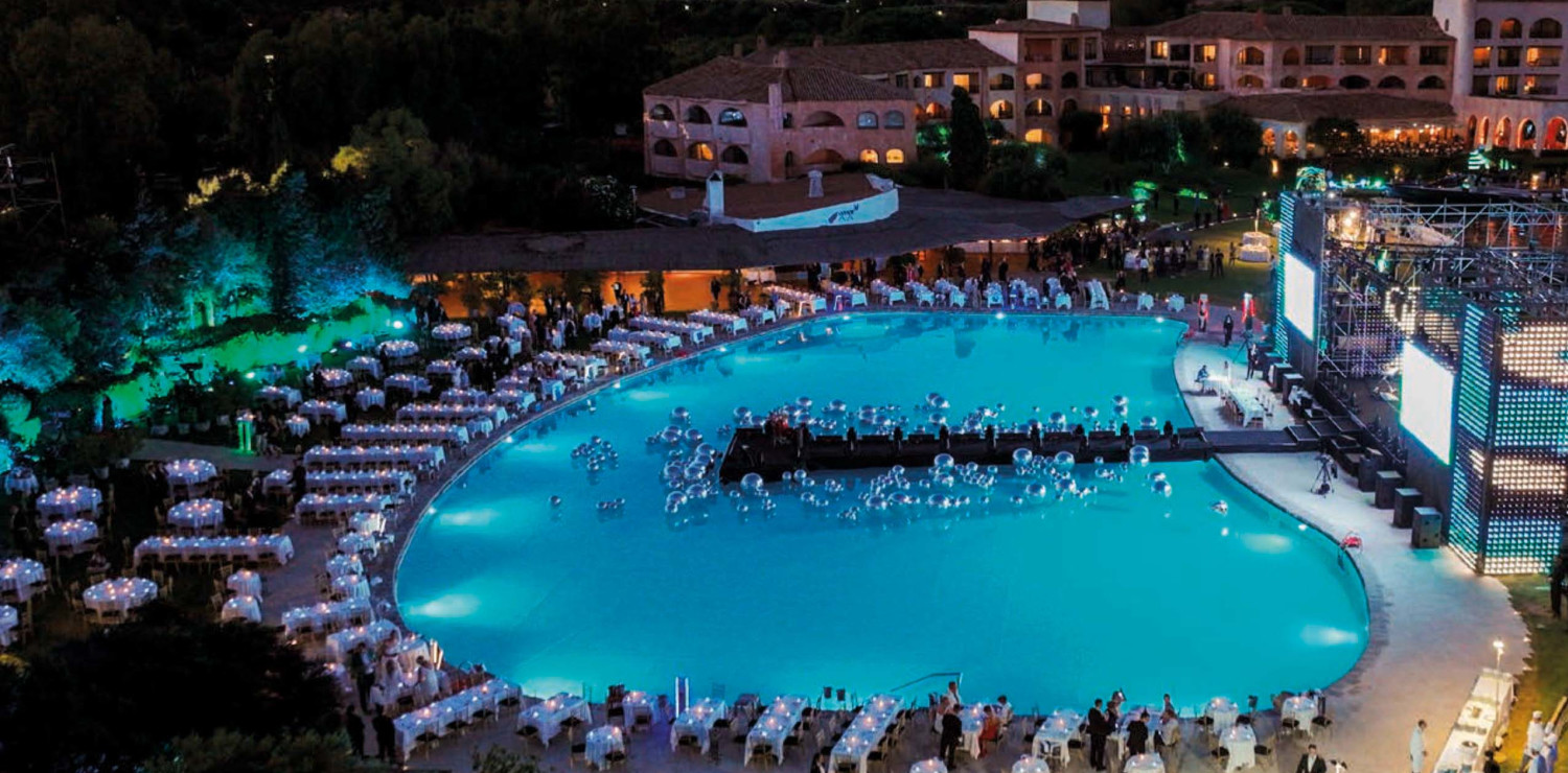 Lungo la suggestiva piscina olimpionica dell’Hotel Cala di Volpe, in uno scenario da millee una notte accarezzati da una fresca brezza estiva, si svolgono le cene di gala più esclusive di Porto Cervo, celebri per le scenografie spettacolari, i menu raffinatiche soddisfano anche i palati più esigenti, e le performance straordinarie di grandi stelle della musica internazionale. Leggeri runner di lino ondeggiano al vento e una distesa di lanterne si unisce allo scintillio delle stelle, dando vita a una straordinaria illusione di continuità tra cielo e terra.