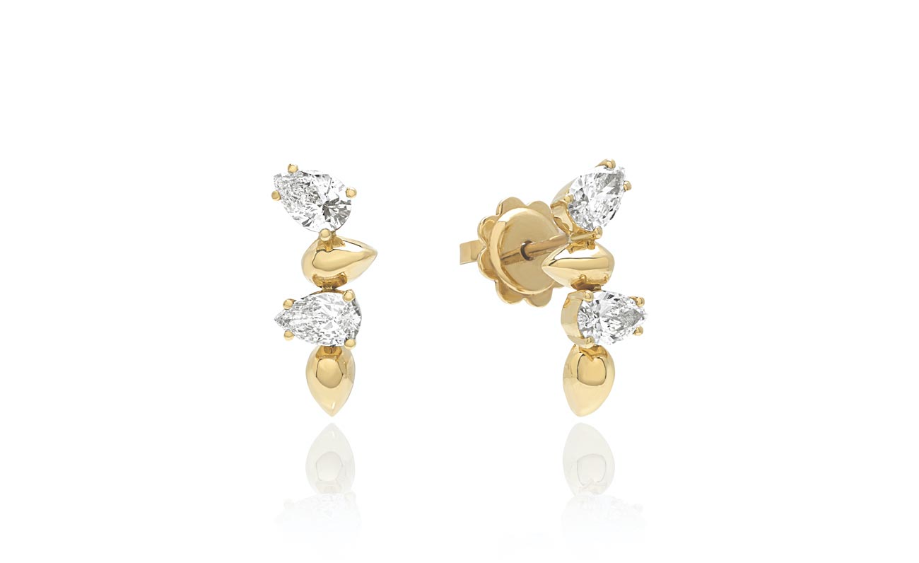 Anche gli orecchini seguono la stessa chiave stilistica, con gocce in oro assieme a diamanti con la stessa forma, sia nel modello a bottone sia in quelli pendenti.