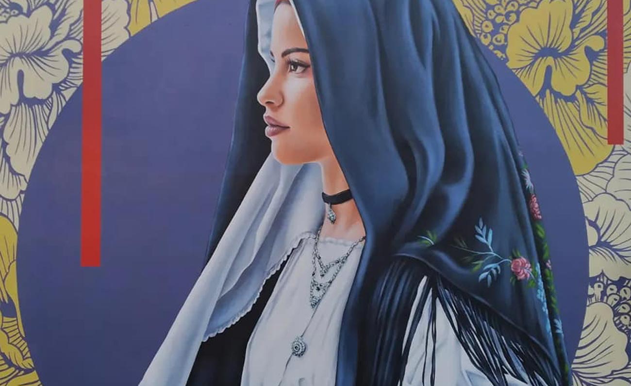 «Nel centro - afferma Patta - è raffigurata una donna in abito tradizionale, caratterizzato dallo scialle ricamato. Alle sue spalle sono presenti elementi e colori che richiamano sempre il suo abbigliamento, come il viola del grembiule e della gonna e il rosso del primo fazzoletto. Lo sfondo floreale, che ricorda anche un broccato sardo, è un chiaro riferimento alle feste paesane e all’usanza di spargere migliaia di fiori lungo le vie in cui passano le processioni».
