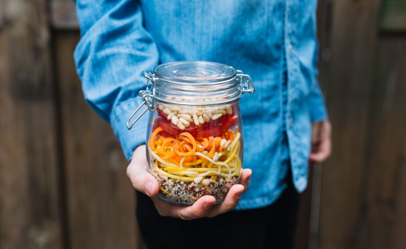 - Midsection view human hand holding pasta salad mason jar Designed by Freepik