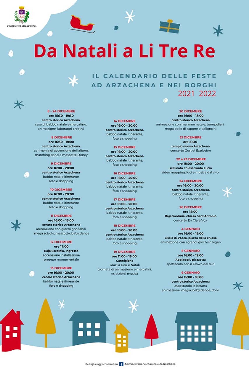 Il pacchetto di eventi è pronto e gli arzachenesi non vedono l’ora di scartarlo. Anche quest’anno sarà il programma Da Natali a li Tre Re ad animare le festività di Arzachena. Si comincerà l’8 dicembre con l’inaugurazione del villaggio di Natale e la cerimonia di accensione del grande albero ecologico nel centro storico. Il calendario è promosso dal Comune su proposta dell’assessora alla Cultura Valentina Geromino, in collaborazione con il delegato al Commercio e Attività Produttive Mario Russu.