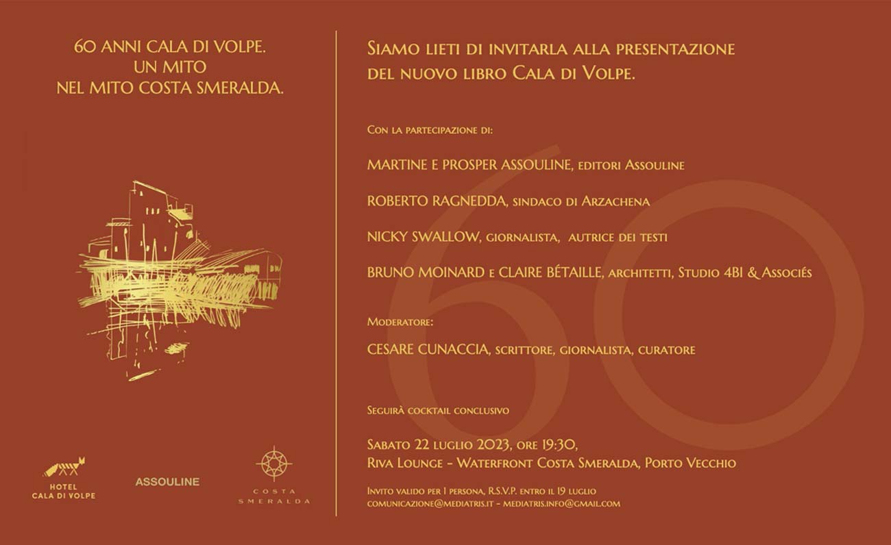 Dopo il successo ricevuto dal volume dedicato ai 60 anni del Consorzio Costa Smeralda, la nota casa editrice Assouline torna a Porto Cervo presentando la sua ultima perla a colori. Un libro che racconta il mito dell\'hotel di lusso di fama mondiale della Destinazione, ovvero Cala di Volpe. L’incontro si terrà oggi, 22 luglio alle 19:30 al Riva Lounge del Waterfront Costa Smeralda in presenza di personalità di spicco delle istituzioni, della cultura e dell’imprenditoria. Nel corso della serata presenzieranno gli editori Martine e Prosper Assouline. il sindaco di Arzachena Roberto Ragnedda, la giornalista Nicky Swallow, e gli architetti dello studio 4BI & Associés Bruno Moinard e Claire Bétaille. A moderare l’incontro lo scrittore Cesare Cunaccia.