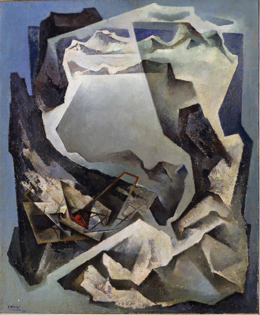 • Tullio Crali, Omaggio a Chavez. La prima trasvolata delle Alpi, olio su tela, 1960, Mart