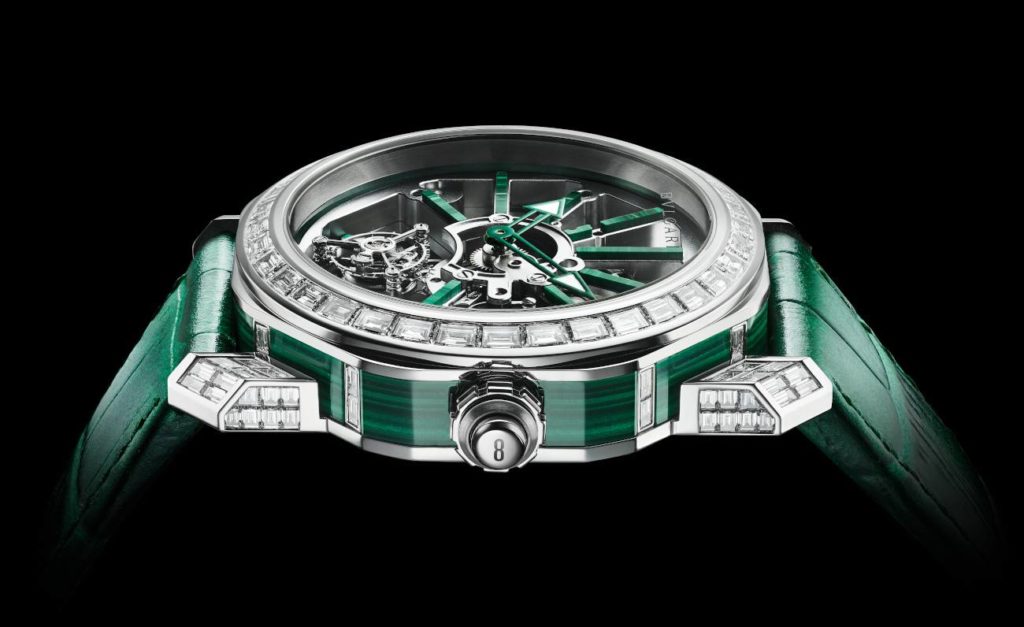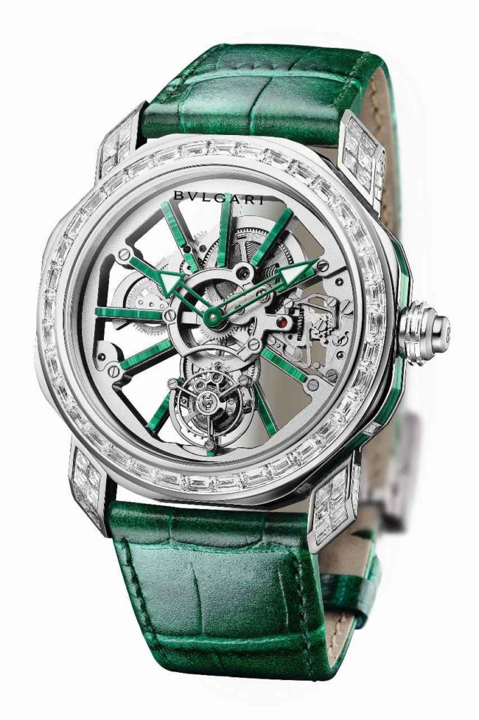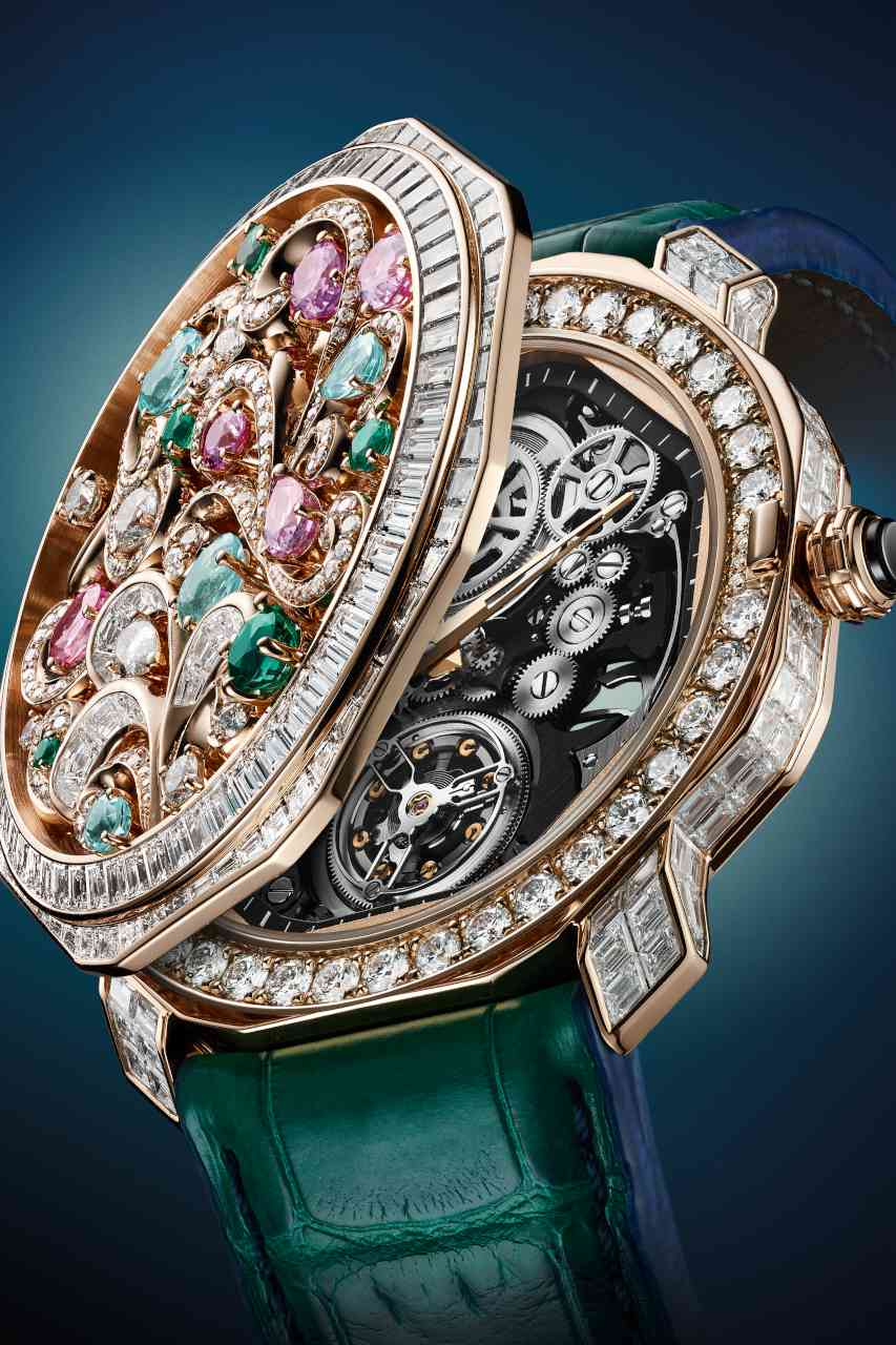 L\'Octo Roma Arabesque segue un\'estetica simile, come è evidente dalla cassa da 44 mm con un ricamo barocco di zaffiri rosa, tormaline, smeraldi e diamanti. Essendo il tourbillon più sottile sul mercato, la parte interna dell\'orologio è altrettanto curata e mette in luce il calibro meccanico di manifattura BVL 268. È una giustapposizione di minimalismo e massimalismo, unita a un’alta competenza tecnica.