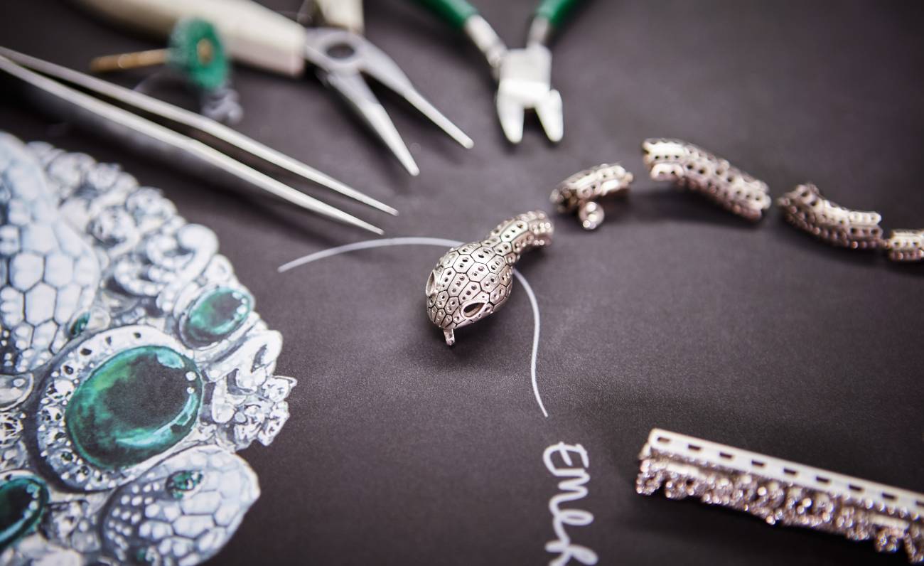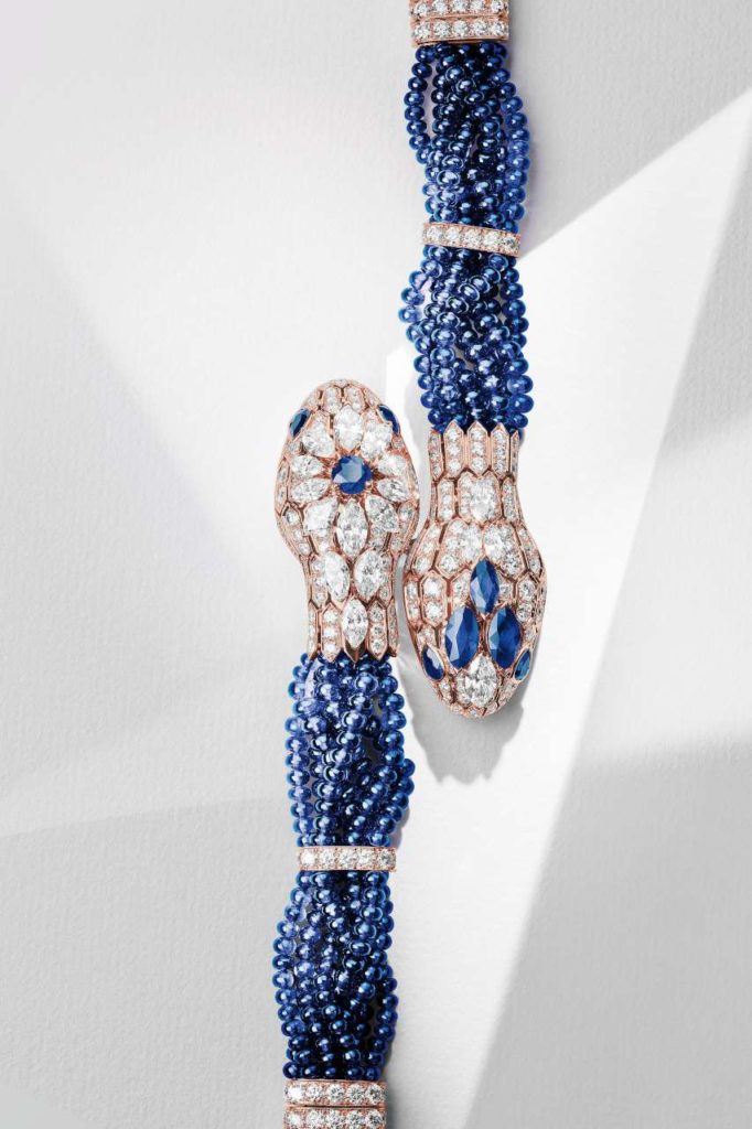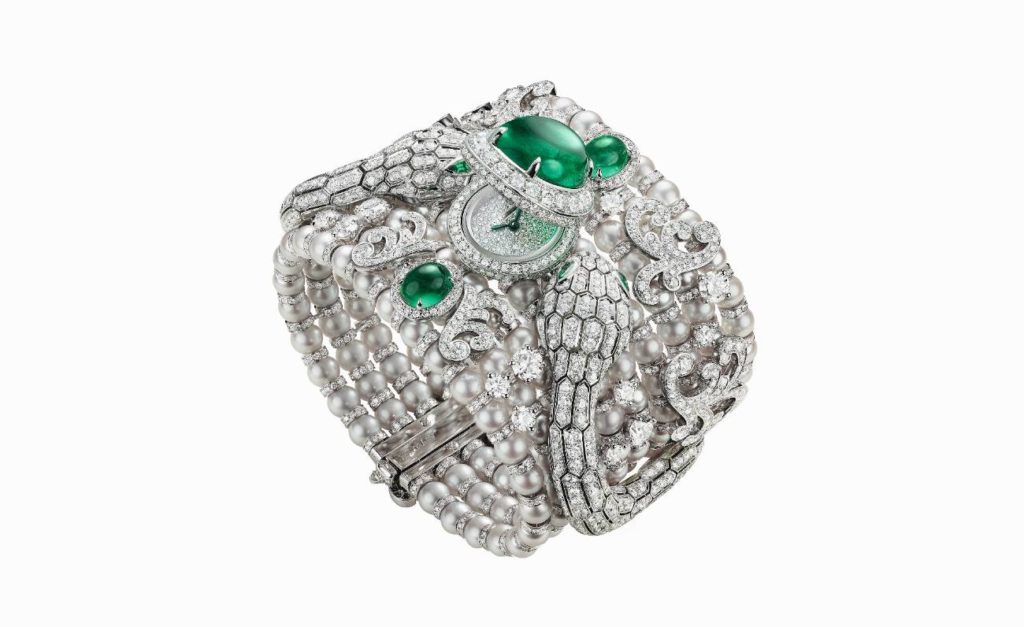 Uno dei pezzi più complessi della collezione Barocko, questa creazione ha richiesto 2.300 ore per essere completata, tra vortici di pavé di diamanti e oltre 220 perle che impreziosiscono il bracciale estremamente flessibile. Scelte e abbinate per colori e dimensioni uniformi, le perle si alternano ad anelli con diamanti per delimitare il bracciale e allinearsi all\'estetica Serpenti. Un raro smeraldo taglio cabochon di oltre 12 carati nasconde il quadrante con diamanti incastonati secondo la tecnica snow set.