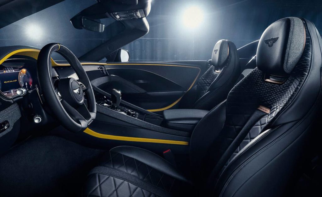 Invece del tradizionale distintivo tradizionale, i designer di Bentley hanno pensato a un nuovo e modo speciale per identificare l\'auto: il nome Bacalar appare sul pannello posteriore, nascosto dietro la lacca della vernice di buccia di riso sostenibile, con la A maiuscola che definisce meglio i contorni dell\'area del paraurti inferiore. Ai clienti viene offerta, infine, la possibilità di acquistare un set di bagagli su misura realizzati da Schedoni - brand italiano del lusso per l\'industria automobilistica per quasi 140 anni – in esclusiva per la propria Bacalar e che si abbina perfettamente alle finiture e ai materiali del cockpit. (Fabio Schiavo)