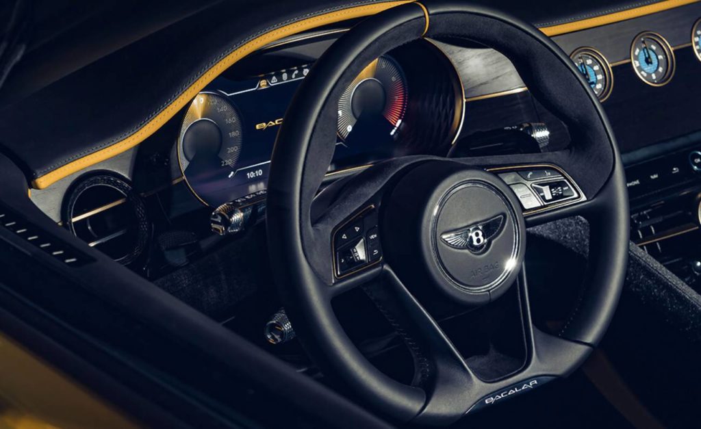 «La nuova Bacalar porta in dote echi di stile del prototipo EXP 100GT - e anche quelli derivanti dal più nobile passato del Brand della B alata, con una ricca storia di modelli ‘en plein air’, la cui progenitrice fu la leggendaria Bentley Blower fatta realizzare nel 1929 da Sir ‘Tim’ Birkin». Il propulsore è un bi turbo W12 6.0 TSI, da 659 CV e 900 Nm, che assicura uno scatto da 0-100 km/h in 3,5 secondi, e velocità massima di 320 Km/h ed è abbinato al cambio automatico e alla trazione integrale. Un telaio adattivo utilizza il sistema Dynamic Ride da 48 volt di Bentley per garantire una guida reattiva e una maneggevolezza e una raffinatezza eccezionali in tutte le condizioni. L\'avanzato sistema di trazione integrale attiva e varia la ripartizione della coppia tra le ruote anteriori e posteriori consentendo alla Bacalar di utilizzare la trazione posteriore il più possibile durante la guida normale per un\'efficienza ottimale e prestazioni dinamiche mentre il sistema di sospensioni pneumatiche controlla il comfort di marcia e il rollio laterale, ammortizzando i passeggeri da movimenti eccessivi. Al centro della console centrale c\'è il display rotante Bentley, un MMI digitale con una schermata iniziale configurabile dal cliente. Il sistema è composto da 40 parti mobili e ruota sull\'impiallacciatura Riverwood all\'avvio del motore per rivelare il touchscreen ad alta risoluzione. Tre schermate configurabili sono in grado di visualizzare le funzioni preferite del conducente, come telefono, media e navigazione. L\'interfaccia è stata progettata per funzionare come uno smartphone moderno, con menu strutturati e semplici da seguire. L\'altro lato presenta tre eleganti quadranti analogici che visualizzano la temperatura esterna, una bussola e un cronometro, offrendo un\'alternativa al touchscreen quando il guidatore desidera staccarsi dal mondo digitale. Per la vettura sono stati scelte finiture e particolari unici. I materiali sostenibili, di origine etica, presentati in anteprima nella concept car EXP 100 GT lo scorso anno, sono diventati realtà nel Bacalar. Questi includono vernici contenenti ceneri di gusci di riso, che forniscono un modo sostenibile per fornire una ricca finitura metallica, lana britannica naturale e Riverwood di 5mila anni provenienti dalle antiche Fenlands dell\'East Anglia. E raffinata pelletteria. Le maniglie delle portiere sono l\'unico elemento esterno in comune con le altre Bentley semplicemente perché contengono il sistema di accesso senza chiave; tutti gli altri componenti in alluminio e carbonio sono specifici per questo modello e sono in parte stati realizzati in stampa 3D. Anche i cerchi di lega da 22\" sono stati disegnati appositamente.