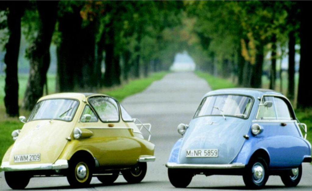 La nonna delle smart car da città. E l\'auto che segna la rinascita del marchio con bavarese. Una micro vettura, monovolume, trasformabile, a due posti fabbricata in Italia dalla Iso, su licenza BMW dal 1955 al 1962: è l\'Isetta. Mono cilindrica come molte auto del periodo destinate a un pubblico molto vasto, era compatta e con linee, per il tempo futuristiche e a basso consumo di carburante (3l/100km). Un due posti secchi e apertura porta frontale e ribaltamento sterzo per accedere all\'interno. Un porta bagagli esterno a ribaltina assicurava anche la possibilità di un uso extra cittadino.