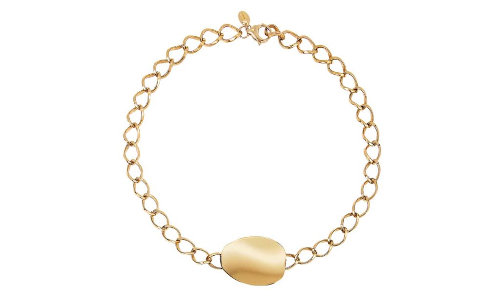 La collana, che può essere indossata come girocollo o come moderno choker, è formata dalle lucide maglie della catena groumette che sostengono l’elemento centrale Be Whisper ed è chiusa da un moschettone con tag del brand.