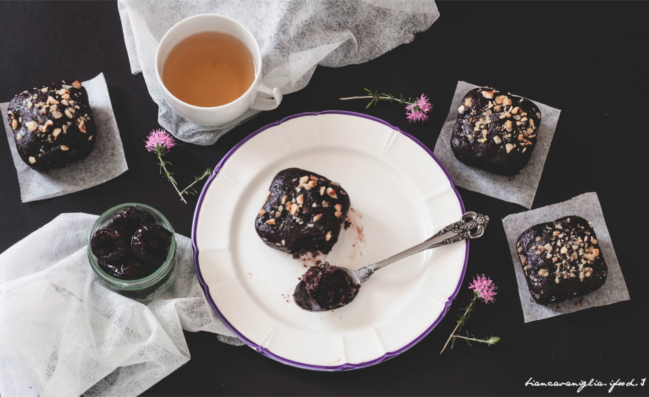 Cuocete per circa 2\'. Coprite il tegame e lasciate riposare per una notte. Estraete i brownie dal forno e quando tiepidi tagliateli in cubetti. Il giorno dopo irrorateli con lo sciroppo e guarnite con menta, prugne e, se volete, nocciole e o mandorle sminuzzate.
