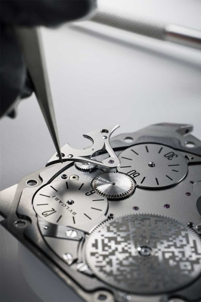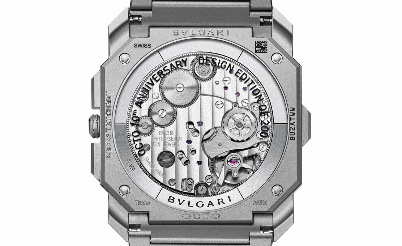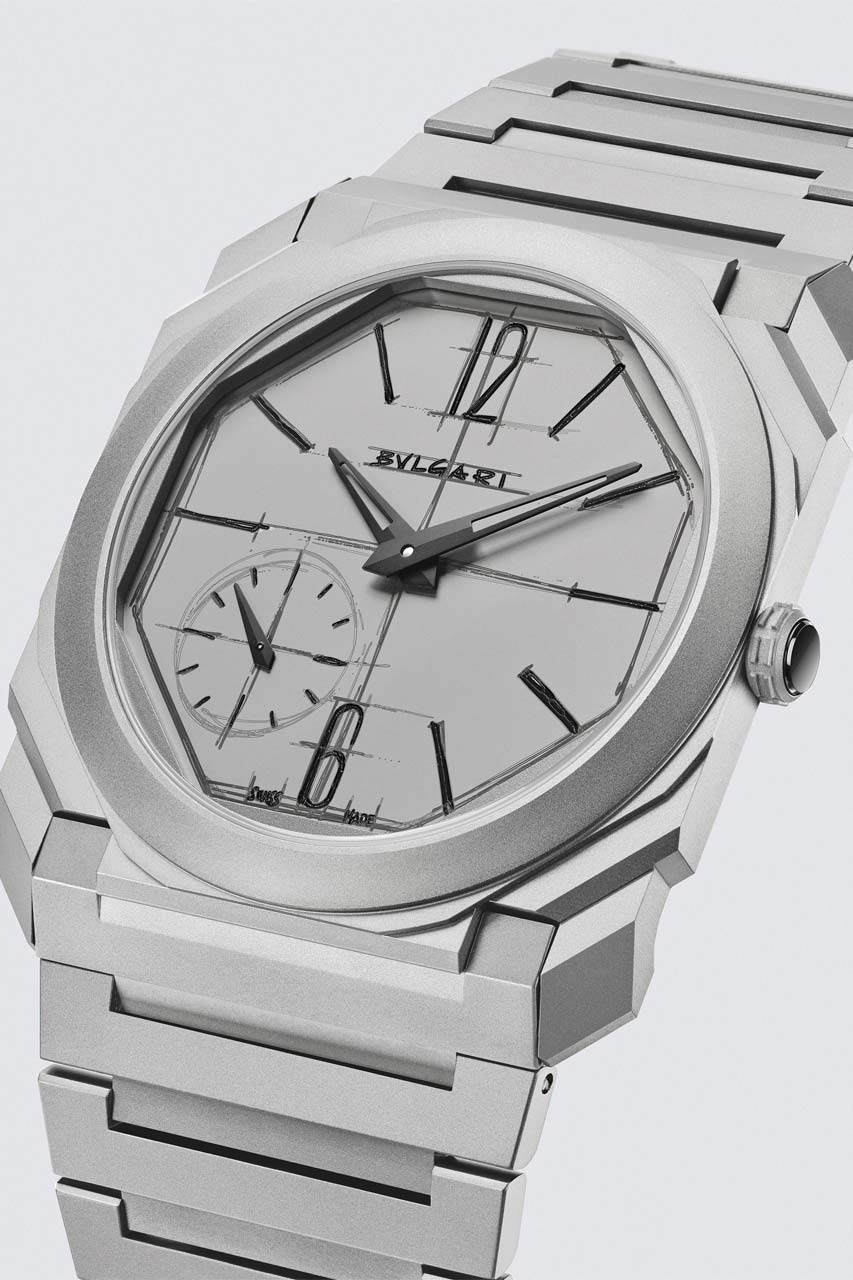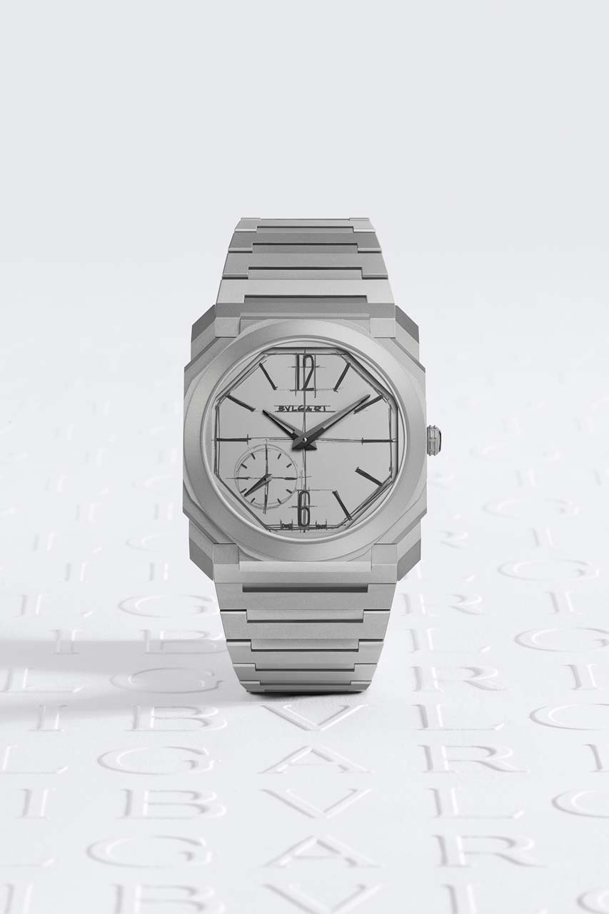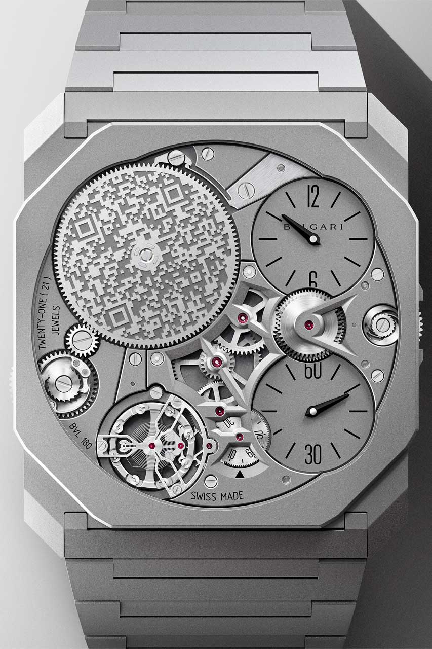 La costruzione dell’orologio prevede che il fondello sia utilizzato come platina su cui sono integrati i 170 componenti del calibro BVL 180. Anche il volume delle maglie del bracciale è stato ripensato: con uno spessore di 1,80 mm, si adattano con continuità alle misure della cassa, pur essendo due volte più sottili di quelle di un normale bracciale Octo Finissimo. Per sfruttare l\'intera superficie dell\'orologio, i quadranti delle ore e dei minuti, l’ampio bariletto - che garantisce 50 ore di riserva di carica - e lo scappamento sono stati resi leggeri dall’apertura circolare della lunetta, adottando una soluzione diversa da quelle consuete.