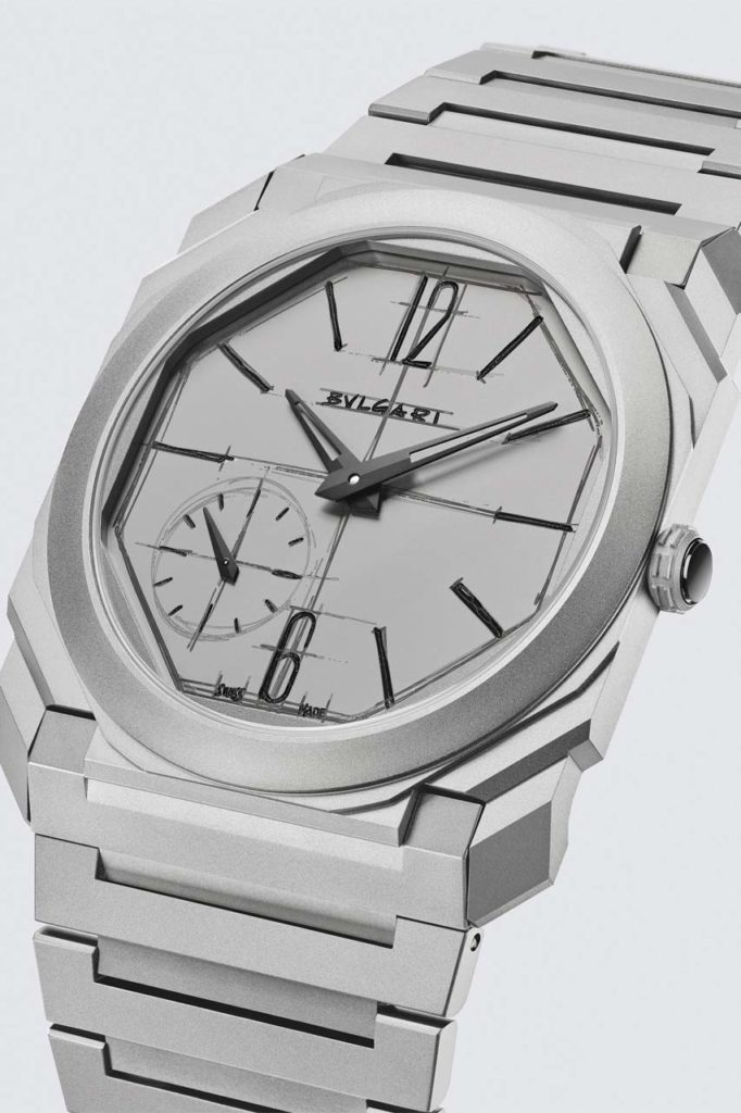 L’Octo Finissimo Ultra perpetua tutti i codici estetici della collezione, a cominciare dall’eleganza del design. Questo presupposto riguardava in particolare lo stile monocromatico in titanio sabbiato, la cassa ottagonale da 40 mm e un bracciale integrato, sottile come la cassa. L’indicazione dei secondi sul contatore a ore 6 è ancora una volta decentrata - altra firma di collezione - rispetto all\'indicazione delle ore e dei minuti, su due contatori di tipo regolatore.