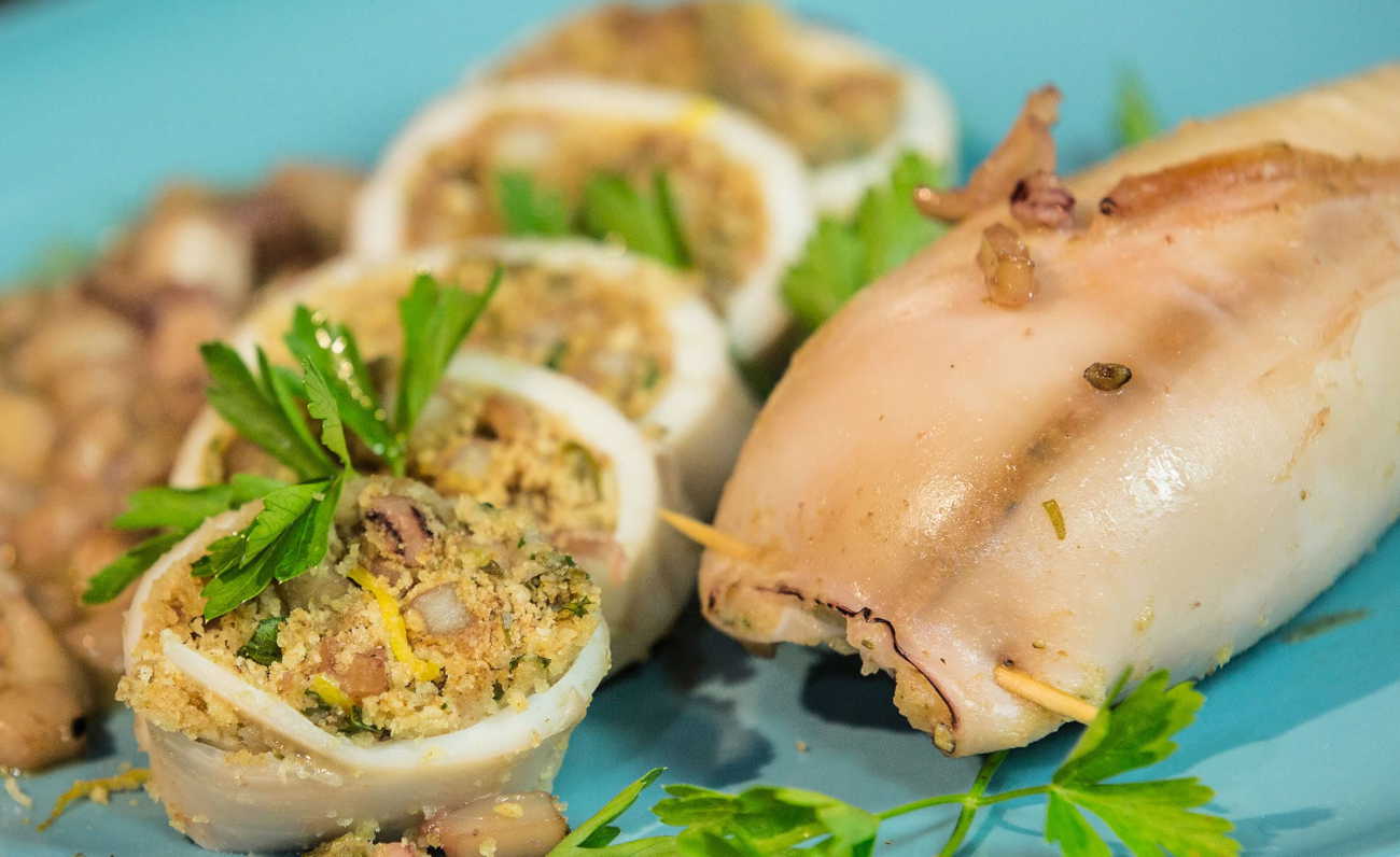 Fatto questo, si può iniziare a preparare il piatto tagliando i tentacoli e le ali che serviranno poi come ingredienti per il ripieno che si andrà a creare. Dopo aver preso un contenitore, si inserirà al suo interno la mollica di pane, prezzemolo, pecorino, uno spicchio d’aglio e un uovo, con l’aggiunta poi di un po’ sale, pepe e le parti del pesce inizialmente tritate. Da non dimenticare l’olio, che serve ad amalgamare il tutto. Le sacche dei calamari andranno poi riempite con il composto e chiuse con uno stecchino, in modo che il contenuto non fuoriesca. Una volta posizionata la padella antiaderente sul fornello, versare un filo d’olio e uno spicchio d’aglio e far rosolare i calamari su ambo i lati, sfumando con un goccio di vino bianco e lasciandoli cuocere per circa 20 minuti.