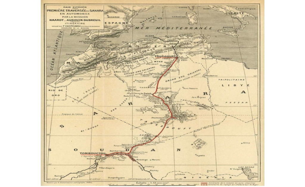 Oltre allo straordinario successo tecnico, dimostrato nel 1922 con gli autocingolati costruiti sulla base di Citroën B2 10 HP modello K1, questa spedizione ha il merito di aver aperto la via alle celebri Crociere Citroën (Nera, Gialla, ecc.) ma anche a vie inesplorate e riprese in seguito dalle mappe militari di tutte le nazioni. L’impresa è stata narrata al cinema e nei libri, dimostrazione di competenza e di spirito di avventura che Citroën incarna da sempre. Senza dimenticare un piccolo aneddoto nella grande storia: l’equipaggio era accompagnato da Flossie, un cane che ha ispirato Milou a Hergé, il cagnolino di Tin Tin. Per preparare la traversata del Sahara, da Touggourt (Algeria) a Timbuctu (Mali), André Citroën creò nel gennaio 1921 uno specifico dipartimento.