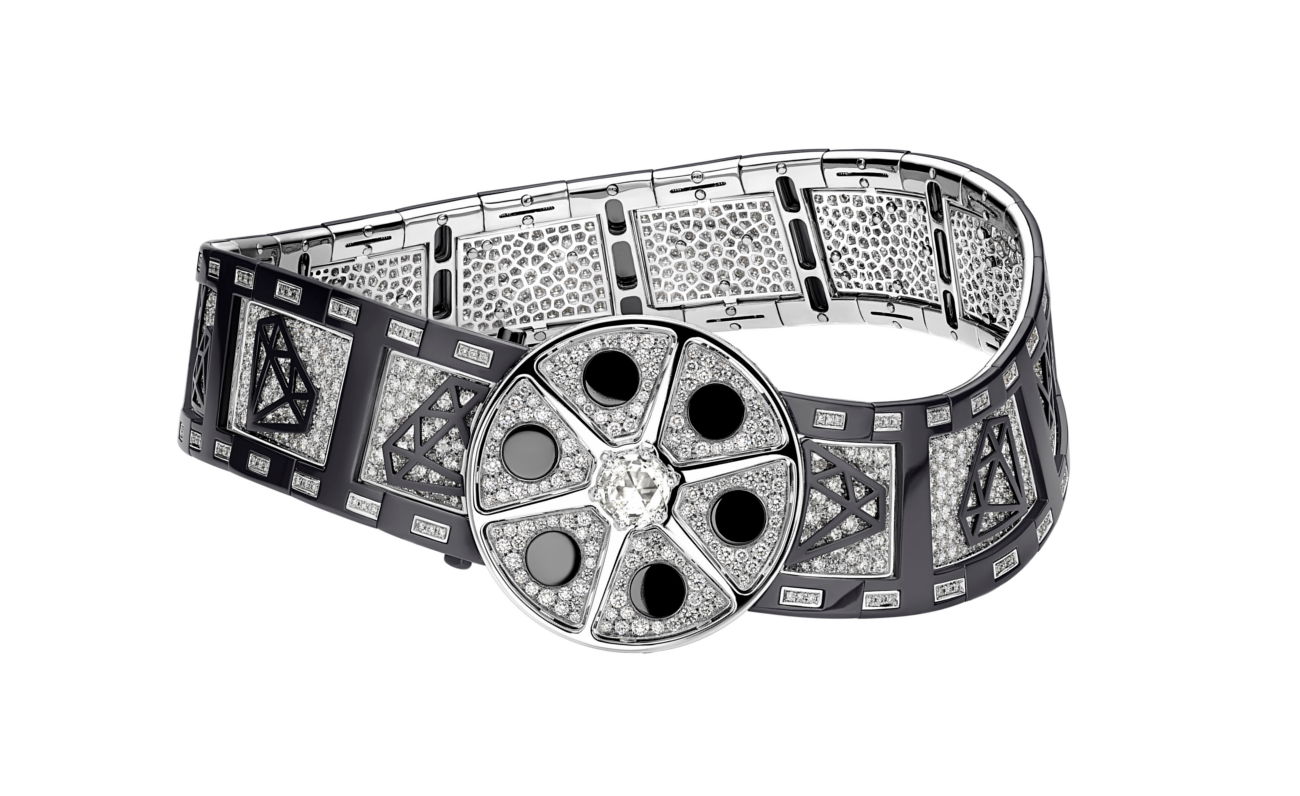 Collier iconico, perfetta sintesi dell’ispirazione cinematografica della collezione, il collier Azione! innova il saper fare orafo, introducendo lo zirconio, un metallo completamente nuovo dal caratteristico riflesso nero-argentato, che evoca la consistenza della vecchia pellicola cinematografica. Come questa, la struttura del collier resta perfettamente fluida, nonostante il pavé di diamanti da 32 carati.