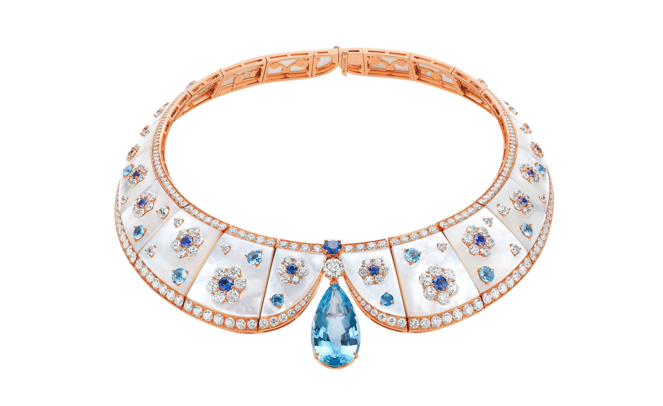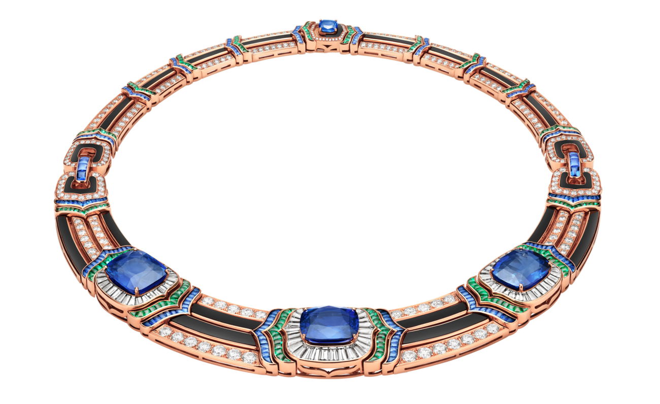 I due pilastri del talento artistico di Bulgari, la passione per il colore e per le gemme più nobili, si uniscono giocosamente nella collana Tesoro dei Pirati. Tre magnifici zaffiri a taglio misto, ognuno con più di 12 carati, siedono in mezzo ad un tripudio di gemme: 188 smeraldi taglio buff-top (5,51 carati), 200 zaffiri taglio buff-top (6,06 carati), 94 diamanti tagliati a gradino e pavé di diamanti (9,18 carati). Ancor più spettacolare di qualsiasi bottino prezioso dei pirati, quest’opera d’arte è realizzata in oro rosa con elementi in onice: con i suoi tagli impeccabili ed una perfetta incastonatura delle pietre, presenta una complessità di design e realizzazione, che solo un maestro artigiano può affrontare.