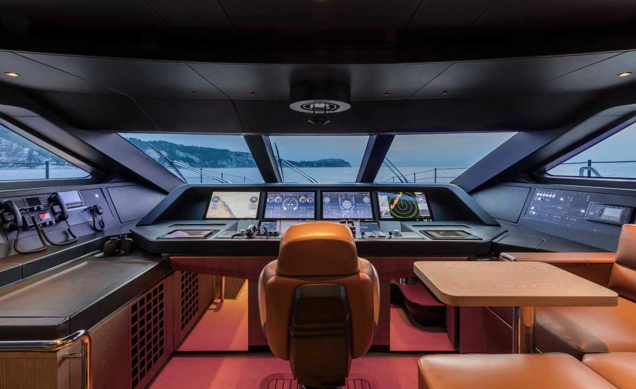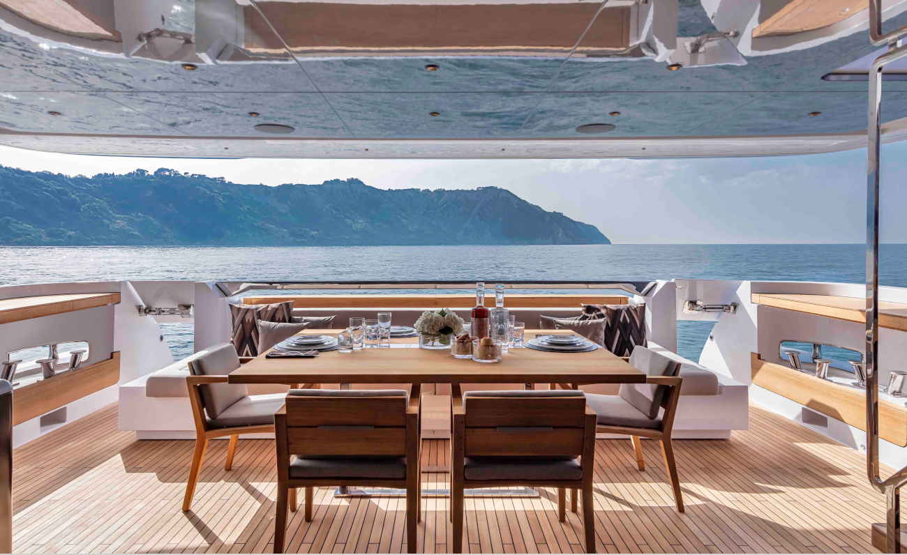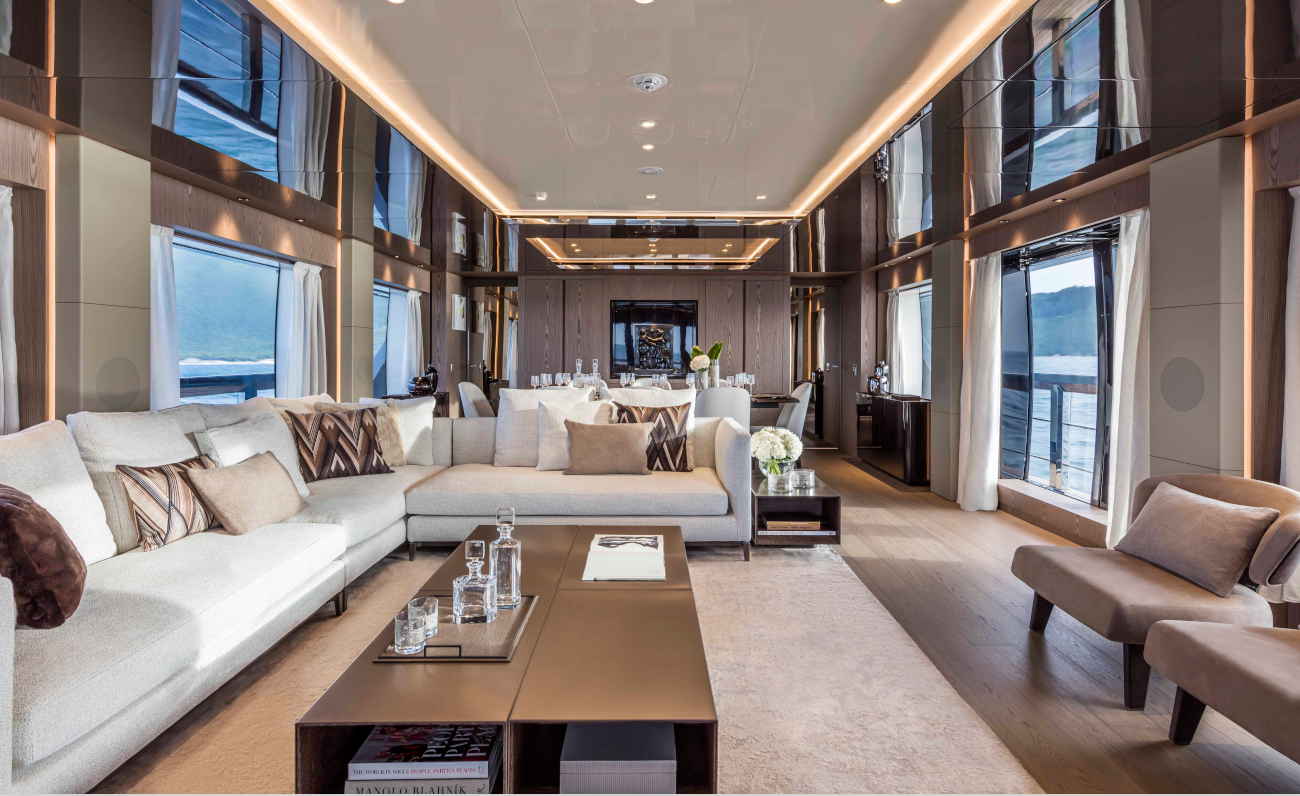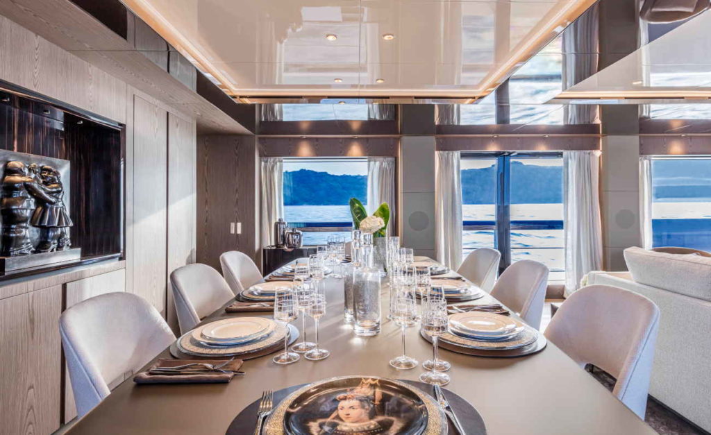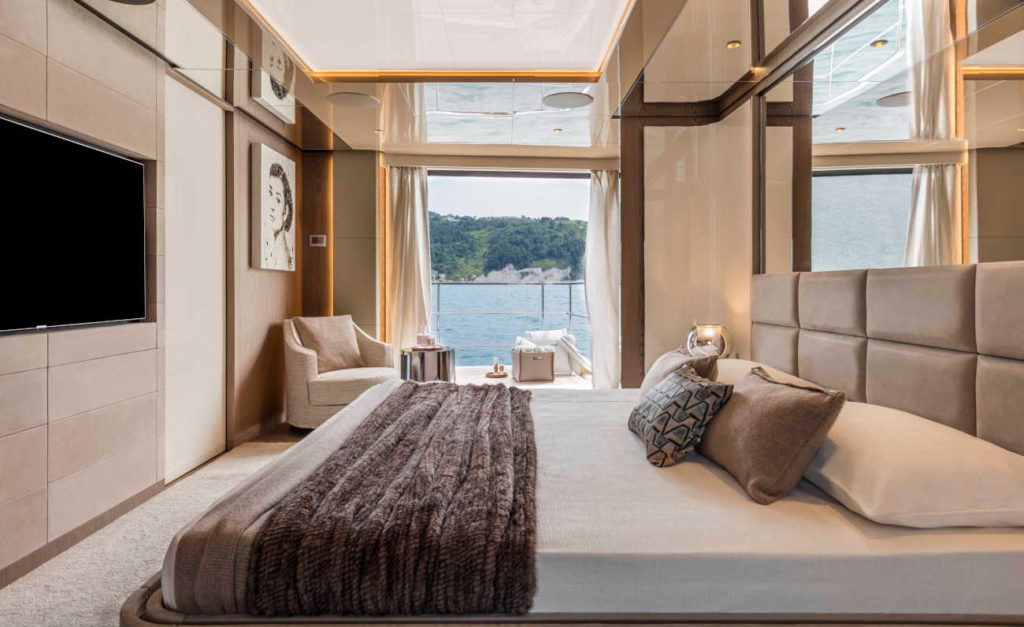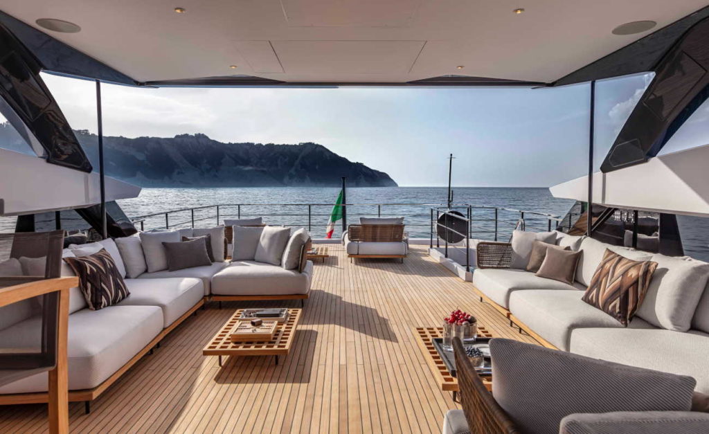Uno yacht che diventa espressione di grande libertà e di scoperta, un cammino d’autore che si riscopre anche negli elementi stilistici e decorativi degli interni grazie alla collaborazione con la Galleria d’Arte Contini e ad alcune opere dei maestri contemporanei Mario Arlati, Fernando Botero, Enzo Fiore e Igor Mitoraj che guidano il percorso interno della barca, tra ingegno e creatività. Emozioni che vengono esaltate dai curati e ricercati interni grazie al perfetto equilibrio formale caratterizzata da forti contrasti cromatici negli arredi e nei rivestimenti e ai i complementi d’arredo. Le aree esterne corrispondono a 220 m² di superficie calpestabile, tutte interconnesse fra di loro e collegate. Sul ponte principale il pozzetto è allestito con un divano extra–large convertibile con schienale regolabile e rivestito in tessuto color sabbia firmato Mariaflora, fronteggiato da un mobile bar in Corian con frigo e icemaker a dritta. Davanti al divano è posizionato un tavolo in teak naturale levigato con struttura in acciaio inox, completato da 4 sedie della collezione Zehnit di Royal Botania con struttura in teak e cuscini in tessuto color taupe firmati Mariaflora. Il flybridge è arredato in maniera chic ma informale collegato direttamente con la prua tramite l’ampio camminamento di sinistra, mentre attraverso il passaggio a destra si accede al pozzetto, da cui si ritorna sul flybridge grazie alla scala sulla sinistra. Il flybridge, poi, è circondato da tientibene in acciaio e protetto da due ampie vetrate laterali, offre ben 53 m² quasi interamente arredabili con elementi freestanding: sulla prima unità si è scelto di posizionare dei prendisole con divani e tavolini bassi. Oltre questa zona, a dritta, un bar con grill, lavandino e frigo precede l’accesso a un balconcino privato, mentre a sinistra si trova la plancia di comando esterna con due sedute pilota e co-pilota. A estrema prua del flybridge, un’altra area configurabile a suo piacimento è a disposizione dell’armatore, con la possibilità di creare una zona spa con vasca idromassaggio. L’intero spazio è sormontato da un hard top che incorpora due sky light, ad aumentare la luminosità dell’ambiente. Una grande porta vetrata da accesso a un open space di 40 m² con altezze che superano i 2m, organizzato in living e zona pranzo in successione. L’essenza dominante è il sabbia fiamma che caratterizza sia i pavimenti che le pareti e si sposa bene con i toni chiari e scuri dei cielini e l’ebano lucido dei mobili sulle murate laterali. Le colonne di sostegno sono tutte rivestite in cuoio, con le fresate realizzate tramite la pregiata lavorazione a punta di diamante. Il salone è interamente arredato Minotti per creare uno spazio conviviale e di grande eleganza.