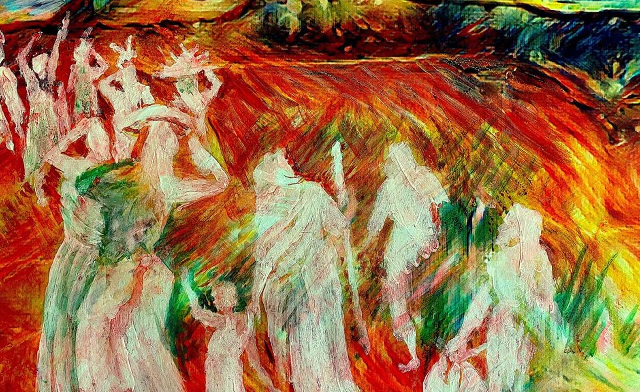 Nell’opera Esodo, per esempio, la realizzazione corale su tela, tratta dalla trasformazione con AI di una foto di una lastra di marmo lucida, Alfonso Silba sullo sfondo staglia in acrilico delle figure umane. Eteree eppure reali, queste sagome bianche aprono a riflessioni struggenti sulla diaspora, sulla fatica cui è costretta l’umanità e sulla profondità insita in ogni generazione.