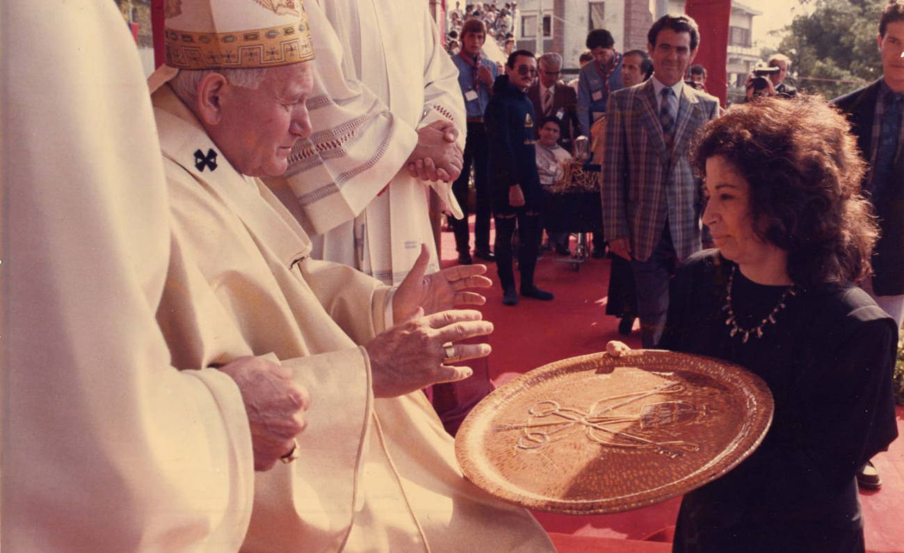 Nel 1985, su lettera invito dal Vaticano, viene convocata all’incontro pubblico svoltosi a Cagliari nella scalinata di Bonaria con Papa Giovanni Paolo II. Per l’occasione donerà al pontefice un prezioso piatto in ceramica lavorato a bassorilievo, con le insegne papali, decorato con smalti policromi, oro e platino.