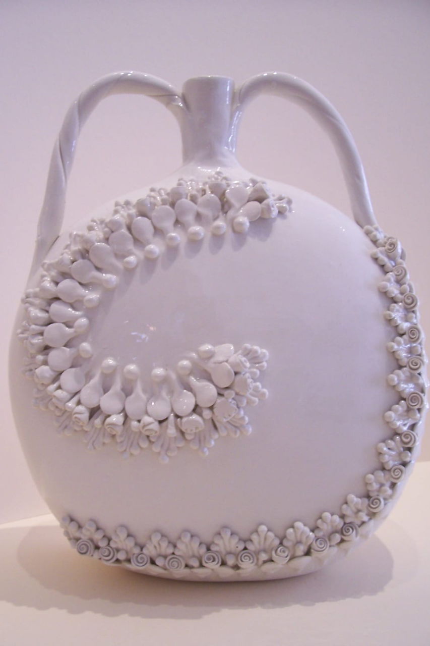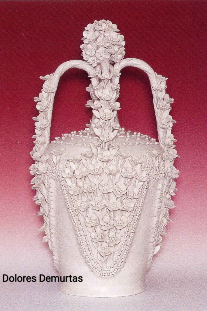 Dolores Demurtas passa attraverso una moltitudine di stili scultorei perfezionando il suo studio sulle superfici decorate. Ne nascono elementi naturali come fiori e foglie della vegetazione tipica sarda, in uno stile decorativo assolutamente originale, bianco su bianco, con i caratteristici piccoli frutti, le roselline e le foglie che riproducono il mirto nelle varie fasi di maturazione. I decori appaiono realistici e suggestivi come delicati pizzi, trasferiti su grandi brocche e vasellami di diverse dimensioni. La Brocca della sposa è il nome che viene attribuito a Firenze nel ‘59 a una sua opera a Palazzo Pitti, ed è l’iconico pezzo che spicca in una collezione identitaria tra scultore che si mostrano tradizionali e insieme particolari.