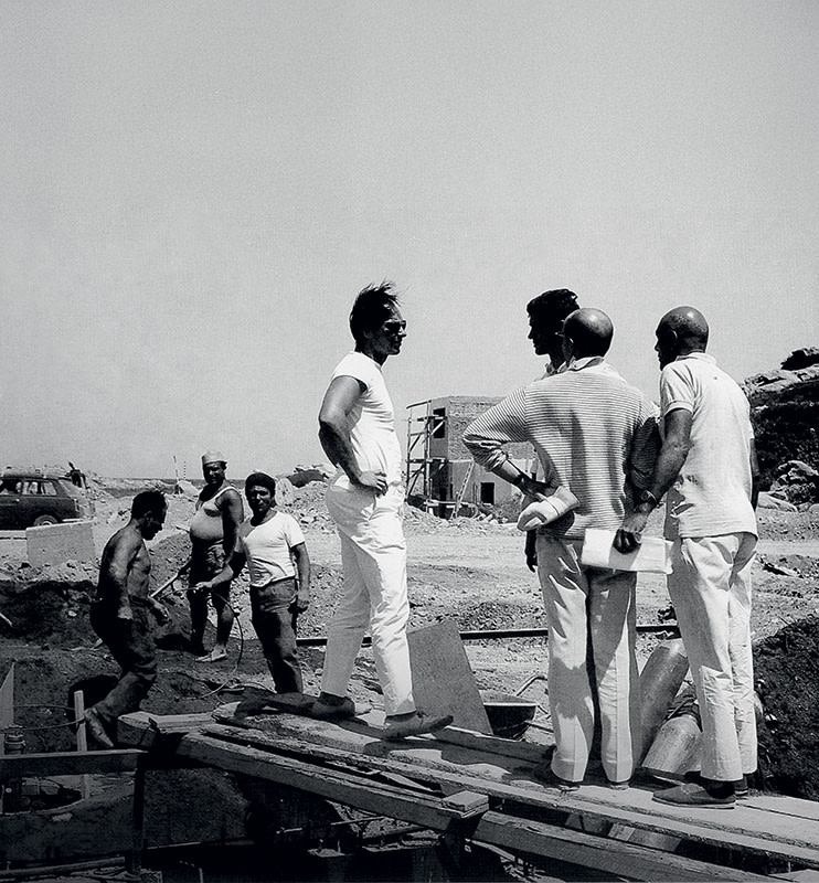 The construction works at Porto Cervo. In the centre, Prince Aga KhanWe also did not question whether it was reasonable to think one would always have to take a ferry to reach Porto Cervo, or whether it was realistic to spend summer after summer without telephone communication. These were not concerns for these romantics, and everyone was confident that the beauty of the landscape would convince “someone” sooner or later. Consequently, the idea of creating a significant and strong leisure industry on the island was embraced as an innovative, perhaps even revolutionary, concept.