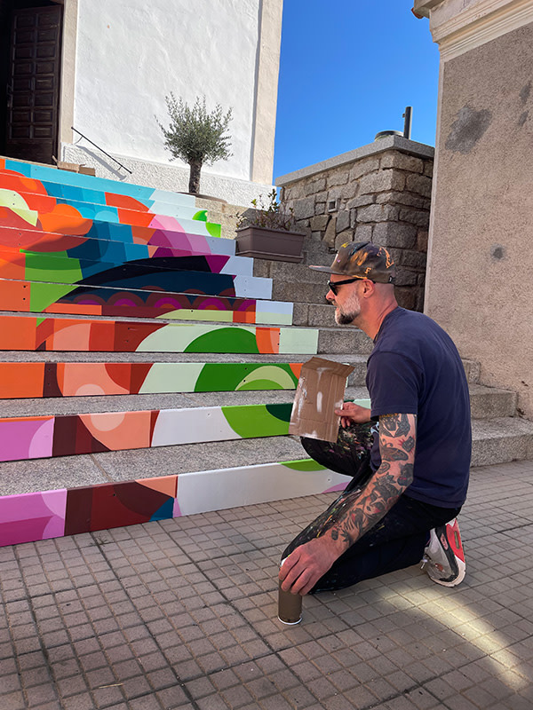 He comes from Rotterdam and he’s the man behind the new art installation on the staircase of the Church of Santa Lucia, which opens the season in Gallura: with artistic direction by Giorgio Casu – curator of the 2021 and 2023 editions – Eelco has designed a large-scale fresco addressing current themes for the stairs overlooking the square.