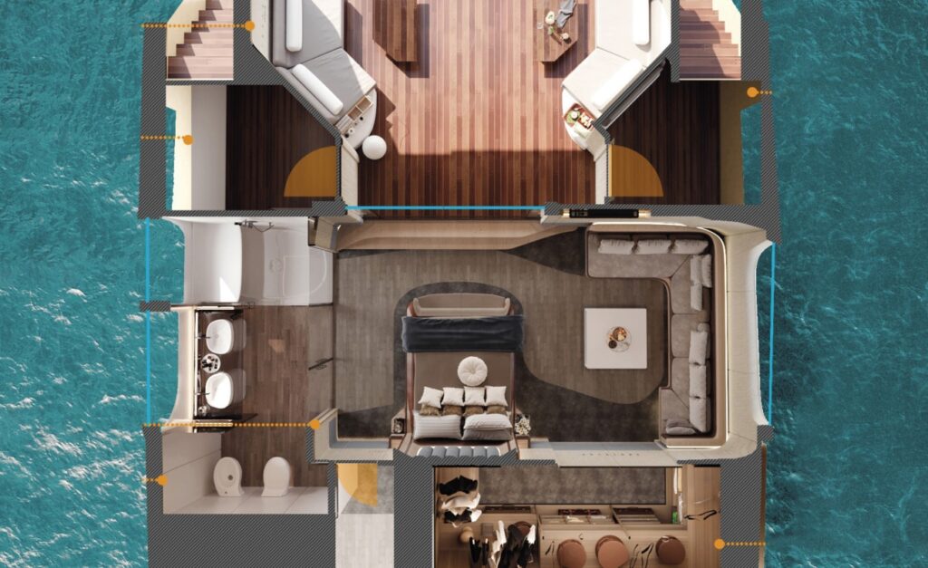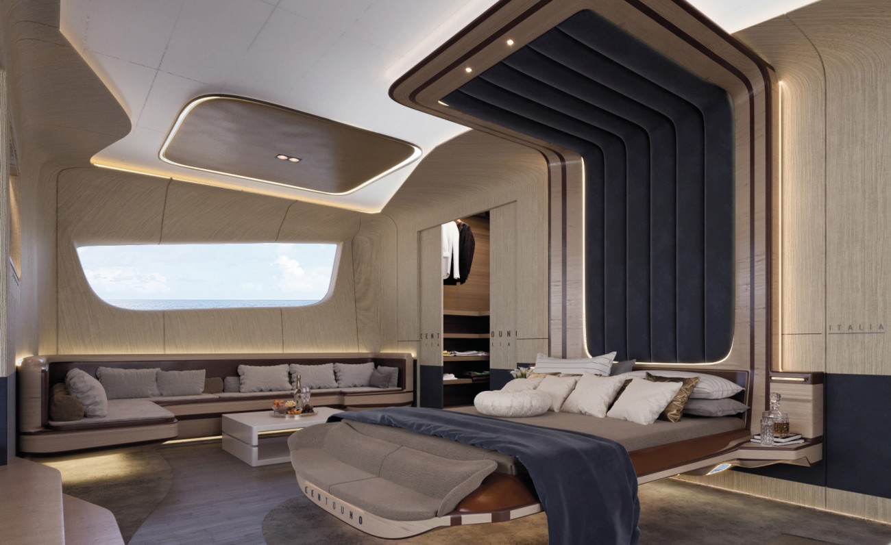 La cabina armatoriale si apre direttamente sugli ambienti posteriori della barca, consentendo una vista diretta sull\'acqua. Gli armatori hanno la possibilità di personalizzare la disposizione delle cabine, includendo fino a cinque per gli ospiti e quattro per l\'equipaggio. L\'imbarcazione integra scelte di progettazione che mirano a garantire la massima privacy. Per questo la zona notte è leggermente ribassata rispetto alla parte posteriore della barca, mentre l\'area living si trova su un piano intermedio e il ponte superiore risulta completamente integrato nel design laterale. Molta attenzione è stata data anche agli arredi, realizzati in collaborazione con lo studio di architettura milanese Grandi Architetture & Partners di Massimo Marzorati