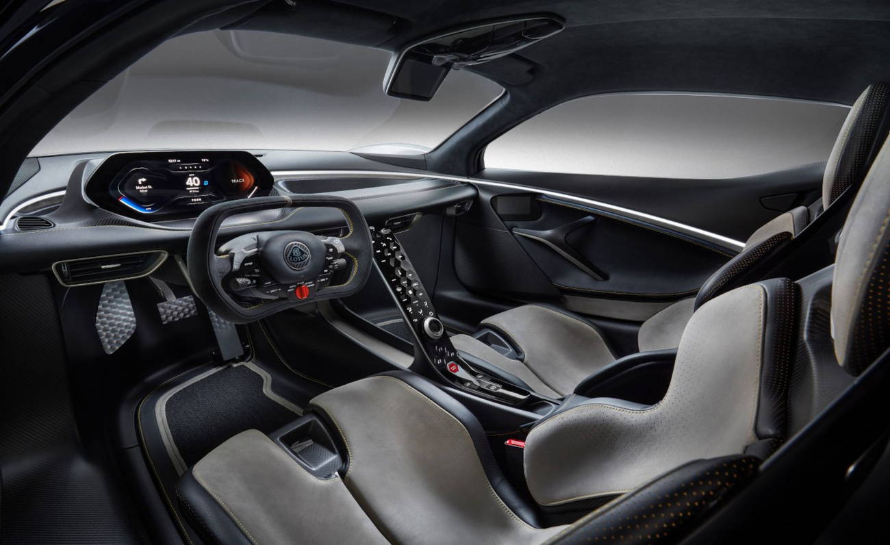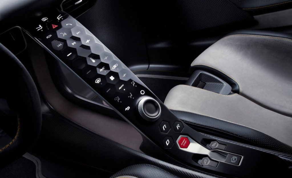 Un pilone centrale presenta una serie di comandi touch posizionati all’interno di incavi esagonali. Di serie è previsto un potente modem di bordo che consentirà all’hypercar di collegarsi al cloud permettendo al conducente di interagire con il computer di bordo, potendo, per esempio, controllare la carica della batteria da remoto, o accendere l’aria condizionata prima di iniziare a guidare.