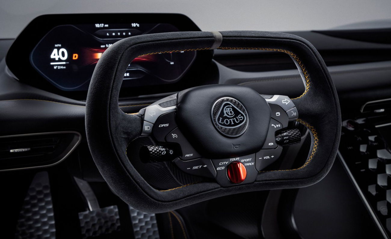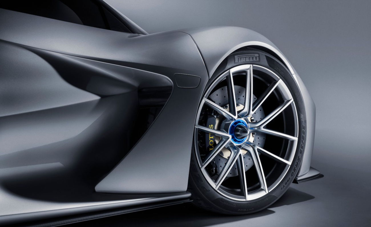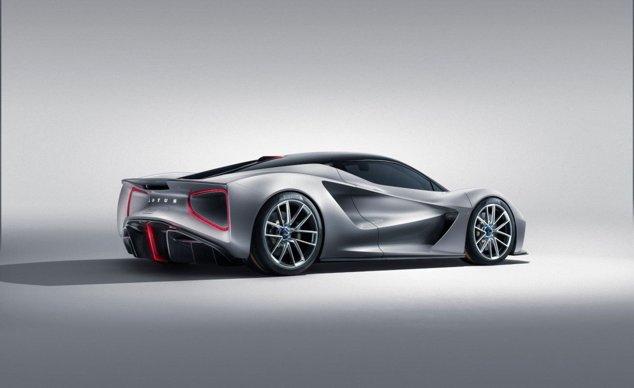Sulla sua nuova vettura Lotus ha realizzato anche un sistema di aerodinamica attiva: davanti un’ala nascosta all’interno dell’ingresso frontale e due flap ai lati, davanti alle ruote, cambiano incidenza a secondo carico aerodinamico e prestazioni, in coda subito dietro il lunotto, sono stati creati due tubi con effetto Venturi che incanalano l’aria e la espellono dalle due grandi aperture posteriori. Una grande ala, infine, fuoriesce dalla sua sede per aumentare il carico e la spinta a terra con lo spoiler posteriore che può assumere diverse inclinazioni per favorire o meno la scorrevolezza dell’auto. Il retro si contraddistingue per le generose feritoie e i fanali che creano un disegno fatto di led e laser mentre tutti gli specchietti sono sostituiti da schermi che proiettano l\'immagine ripresa da videocamere ad altissima definizione. Gli interni sono all\'altezza, tutto in stile racing, dai sedili con cinture di sicurezza a tre punti d\'appoggio al volante quadrangolare, con serie comandi touch, staccato dal cruscotto digitale dotato di un display che da’ informazioni strettamente necessarie alla guida che ha cinque modalità: dalla più tranquilla Range alla più tough, Track.