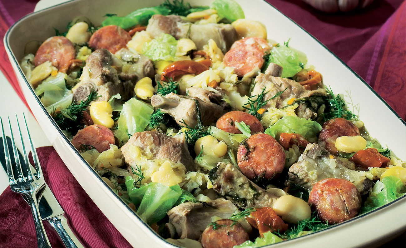 Lasciate a bagno le fave in acqua tiepida per una notte. Il giorno seguente in abbondante acqua salta unite i vari tipi di carne, precedentemente tagliati a pezzi regolari, il finocchio selvatico, la cipolla tritata, il mezzo cavolo verza tagliato in striscioline, la salsiccia tagliata a rondelle e gli spicchi d’aglio.