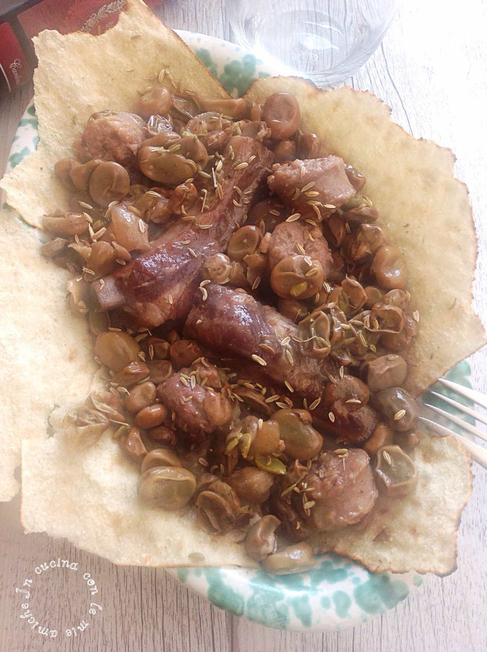Fate bollire per circa ½ ora, Intanto prendete le fave della sera prima e lavatele sotto acqua corrente per poi aggiungerle con il peperoncino alle carni e alle verdure già in cottura. Tenete sul fuoco per 2 ore e solo alla fine regolate il sale. Disponete sul fondo delle singole fondine alcuni fogli di carta musica, ricopriteli con alcuni mestoli della favata e insaporite con due giri d’olio versato a filo e una grattugiata di pecorino. Potete accompagnare il tutto con pane sardo abbrustolito.