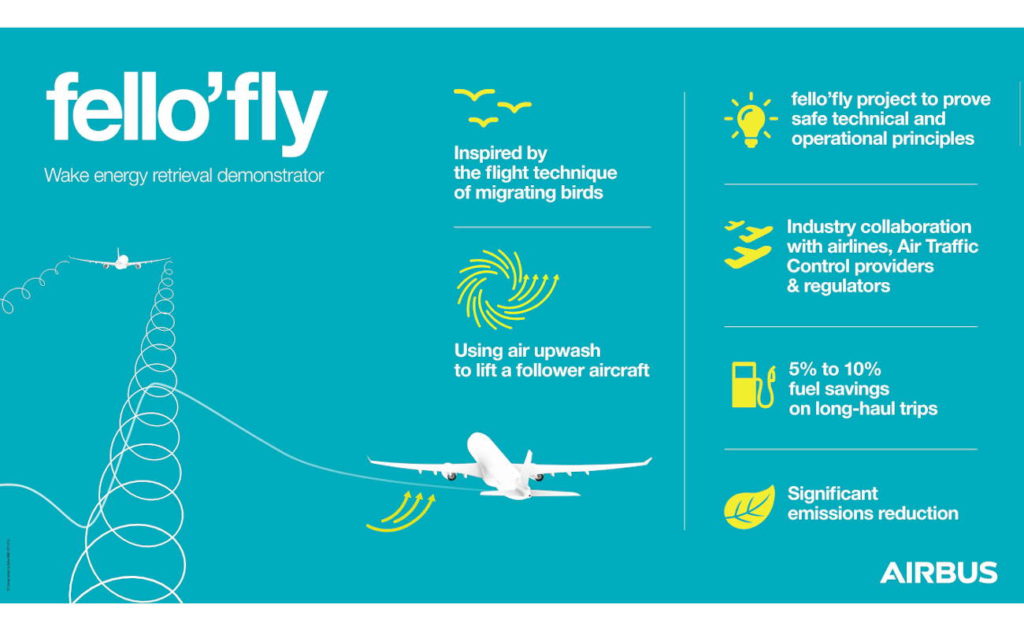 Attraverso fello’fly l’aeromobile che segue recupera l’energia persa dalla scia dell’aeromobile che lo precede, volando nella corrente ascensionale che questo crea. Questa modalità di volo consente di generare portanza per l\'aeromobile che segue, consentendogli di ridurre la spinta del motore e, di conseguenza, di ridurre il consumo di carburante tra il 5 e il 10% per viaggio. La soluzione tecnica a cui Airbus sta lavorando prevede funzioni di assistenza al pilota, necessarie per garantire che l\'aeromobile in volo rimanga posizionato in modo sicuro nella corrente d’aria ascensionale dell\'aeromobile che lo precede, mantenendo la stessa distanza l’uno dall’altro e un\'altitudine costante. In termini di soluzioni operative, Airbus sta lavorando, in collaborazione con i vettori e gli operatori ATC, per identificare le esigenze operative e le soluzioni più adeguate per la pianificazione e l\'esecuzione delle operazioni di fello’fly. Questo impegno mette in luce l\'importanza che Airbus attribuisce alla conduzione di attività che coinvolgono l’intero settore, per raggiungere gli obiettivi di riduzione delle emissioni definiti dall\'Organizzazione Internazionale dell\'Aviazione Civile (ICAO) e dal Comitato per la Protezione Ambientale (Committee on Aviation Environmental Protection – CAEP).