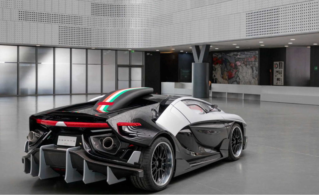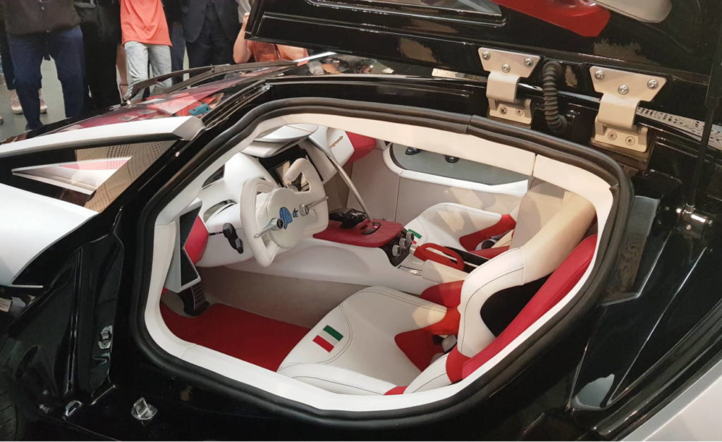 Una vettura particolare, quindi e non solo perché ha rovesciato dei canoni stilistici da sport car considerati immutabili, come il musetto estremamente allungato o il profilo laterale con la parte posteriore corta e raccolta, rastremata che presenta un unico fanale orizzontale, una enorme zona dell’estrattore e due grossi scarichi. O per la linea a cuneo modellata dal vento caratterizzata da due fascioni laterali che racchiudono come in una morsa il corpo centrale della hypercar, l\'aerodinamica attiva che rende alcune delle parti della carrozzeria semoventi o i fanali sono retrattili. O pe i freni in materiale composito in carboceramica, diametro 380 mm e spessore 38 mm ventilati e forati, con pinze fisse monoblocco in alluminio a 6 pistoncini anteriori e 4 posteriori. Ma anche per le personalizzazione estremizzate, ad esempio il laboratorio artigianale che allestisce gli interni dispone di 1200 tipi di pelle tra cui scegliere. Con un concept di forme che unisce modernità estrema e ricordi anni \'80 la Asfanè si distingue per la cura nei dettagli, Interni ed esterni. Ma è soprattutto dentro il cockpit quello che colpisce. Per entrare è necessario aprire le portiere, ad ali di gabbiano che si azionano da maniglie apri-porta a forma di pistole dorate, premendo il grilletto e si scopre così un allestimento, uno dei vari: tappezzeria in pelle di colore bianco, impreziosita da elementi di contrasto di colore rosso. Il volante ricorda nella forma quello che solitamente troviamo nella plancia di comando di un aereo. (Fabio Schiavo)