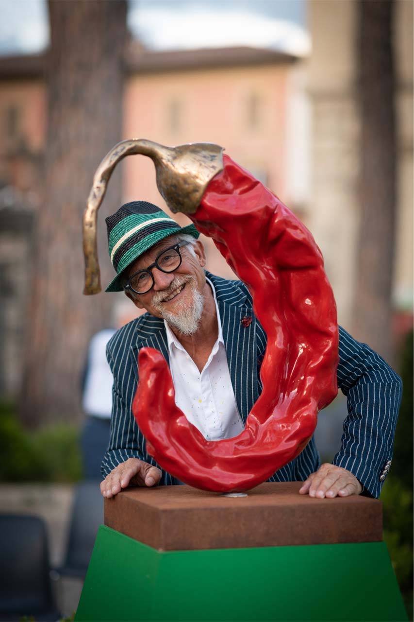 Perfino una star planetaria come Andrea Bocelli lo ha voluto tra i suoi artisti del cuore: la meravigliosa melagrana, reinterpretata con il suo stile che è ormai leggenda, è stata collocata, in tutto il suo splendore, al Teatro del Silenzio di Lajatico. Anche Mario Draghi, da dominus della Banca dItalia, stregato dalla bravura di questo sardo eccellente, lo scelse come autore per il suo ritratto da esporre presso la galleria dei Governatori. Così come Farinetti lo ha voluto per creare il monumento al Nebbiolo, un gigantesco grappolo d\'uva che dal 2018 celebra le terre delle langhe piemontesi. È infinito il palmares dei suoi successi internazionali ma uno di quelli che ha lasciato il segno parla cinese: era il 2015 quando con cinque peperoncini rossi viene inaugurata la nuova sede del Consolato Italiano mentre un altro, di oltre 7 metri daltezza, colora la grande piazza di Chongqing, metropoli del Sud della Cina con quasi 40 milioni di abitanti. Impossibile descrivere lo stupore degli abitanti e degli appassionati giunti da tutto lOriente per apprezzare i capolavori dello scultore arrivato da Banari, il paese della trachite rossa.