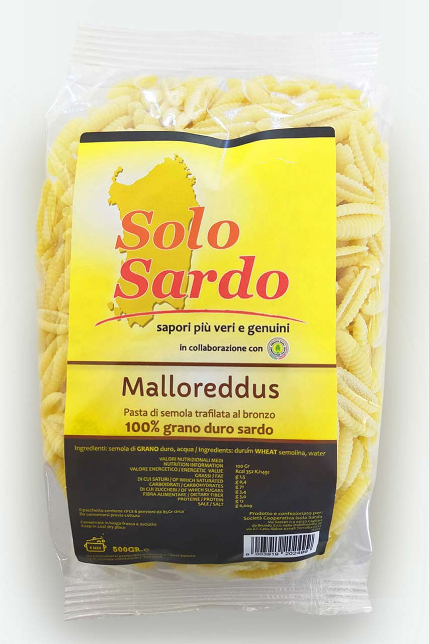 \"Solo Sardo\" presenta una gamma di sette tipi di pasta (spaghetti, linguine, fregula, mezze penne, tortiglioni, malloreddus e gnocchi sardi) e due pani tipici: il pane carasau e il pane guttiau, due specialità che da sempre sono un alimento base nella dieta locale. Il lungo processo di essicazione e trafilatura al bronzo può richiedere dalle 12 alle 16 ore, a differenza della comune pasta commerciale che subisce un\'essicazione di 2 ore, che determina una precottura delle proteine nobili e un risultato, al gusto, molto lontano dal sapore autentico.