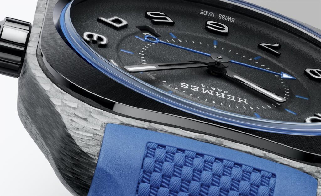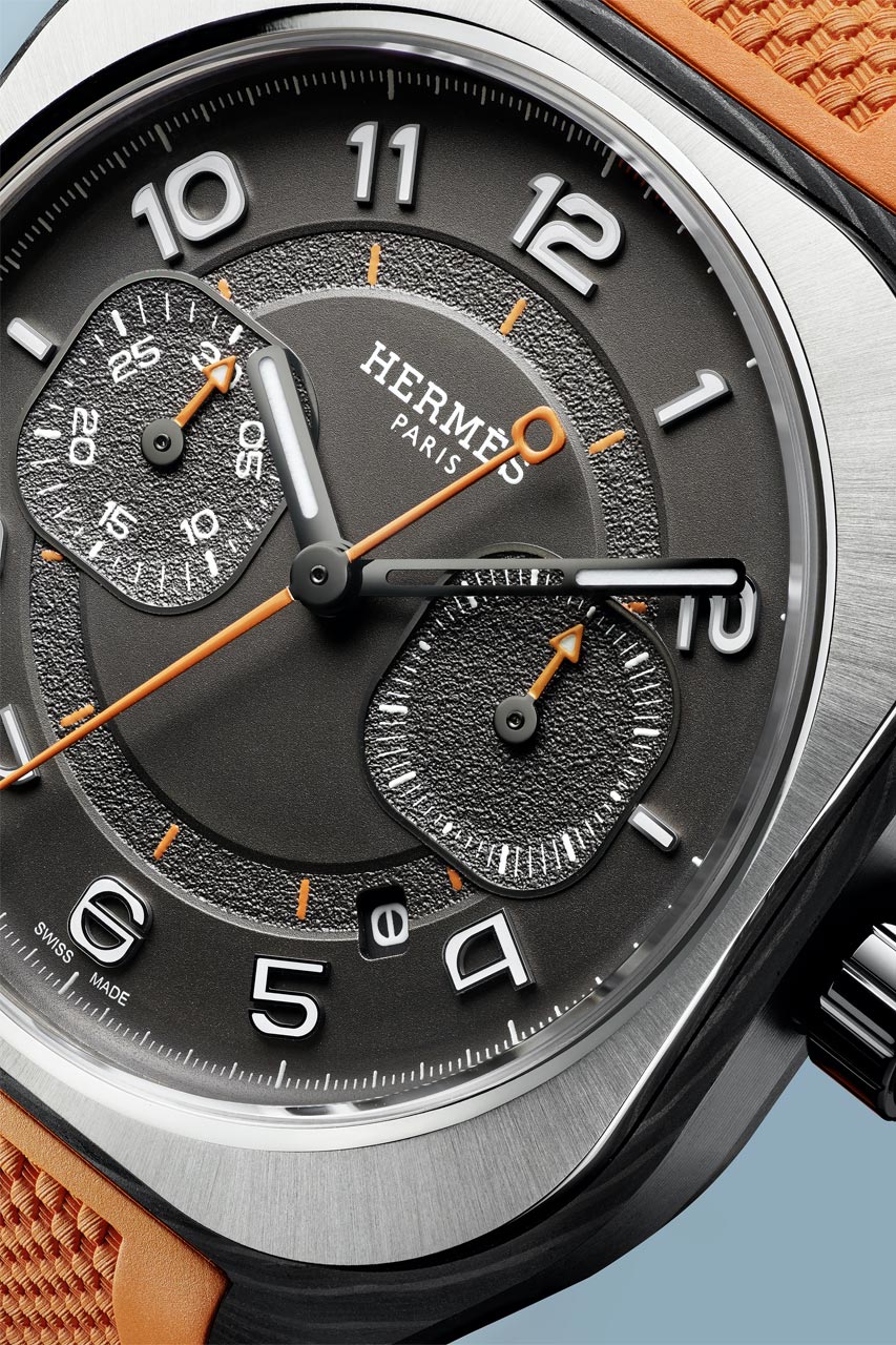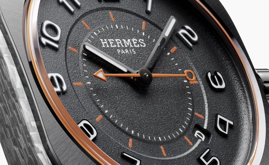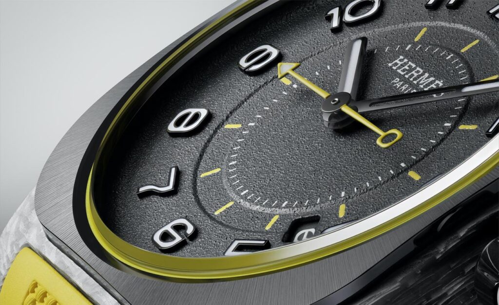 Un materiale che è anche resistente. La cassa è infatti impermeabile fino a 10 bar, grazie anche alla corona avvitata in ceramica nera, abbinata al materiale della lunetta. In questo orologio la differenza la fa il quadrante, giocoso ma altamente leggibile, che utilizza lo stile “girevole” degli indici delle ore, simili ad altri modelli creati da Hermès nel passato.