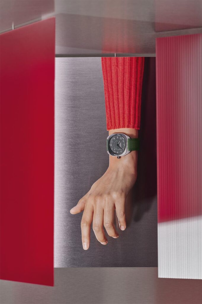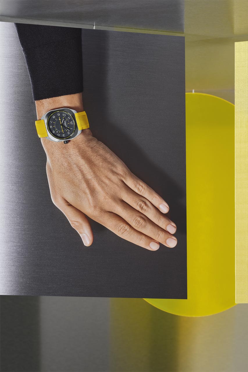 Oltre alla leggibilità, ciò che distingue il quadrante sono naturalmente gli accenti di colore che si fanno strada sui quadranti dell\'orologio H08, presenti negli indici, nella lancetta dei secondi e nel sottile anello che incornicia il rehaut interno al quadrante. Anche se il grosso del colore si ritrova sul cinturino in caucciù testurizzato, chiuso da una fibbia pieghevole in titanio.