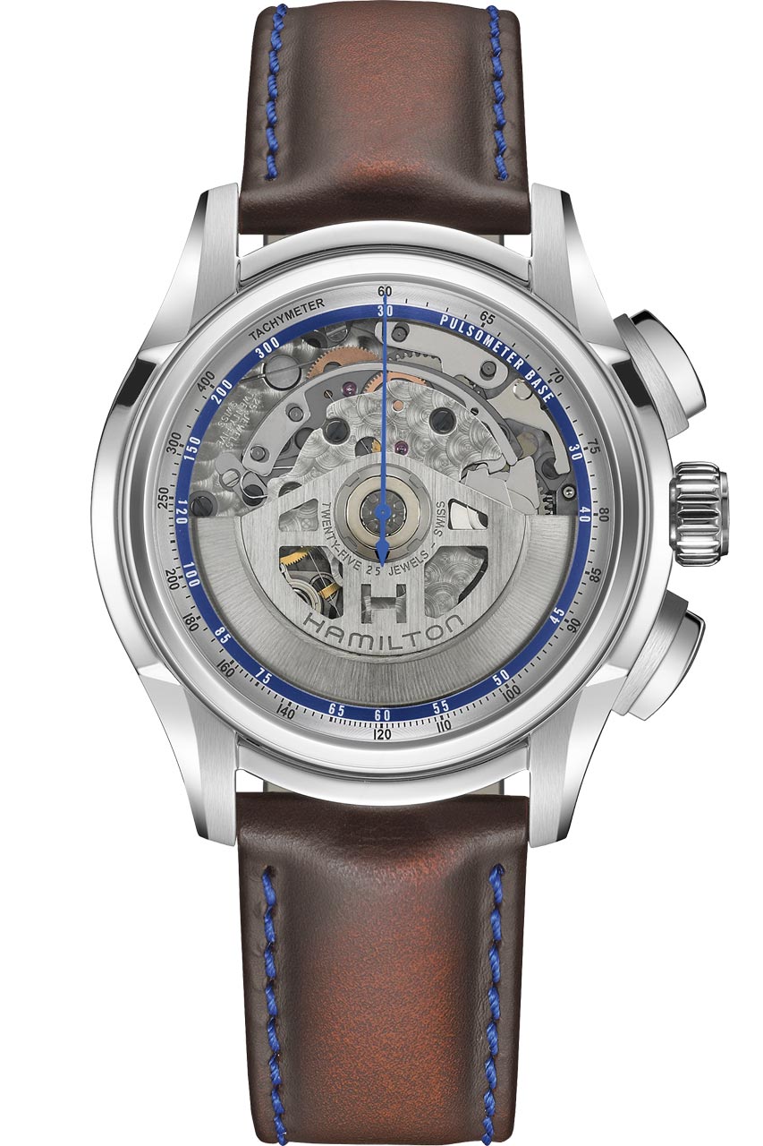 Una volta ruotata la cassa, si apre il secondo quadrante con una scala tachimetrica in grigio e una pulsometrica in blu. Esse consentono a chi conduce una vita dinamica di controllare e misurare la frequenza delle proprie pulsazioni cardiache, oltre alla velocità raggiunta. Il design scheletrato del quadrante lascia intravedere il movimento cronografo automatico H-41, con in primo piano la grande massa oscillante.