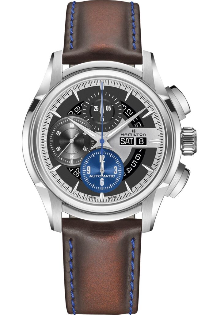 A sottolineare la volontà di Hamilton di proporre l’orologio come un connubio di tradizione e innovazione, il Jazzmaster Face 2 Face III è abbinato a un cinturino in pelle marrone effetto patina, accentuato da cuciture blu su entrambi i lati. Oltre a creare un bel contrasto cromatico e a dare un tocco sportivo all’orologio, queste impunture richiamano i tocchi di blu presenti sui quadranti.