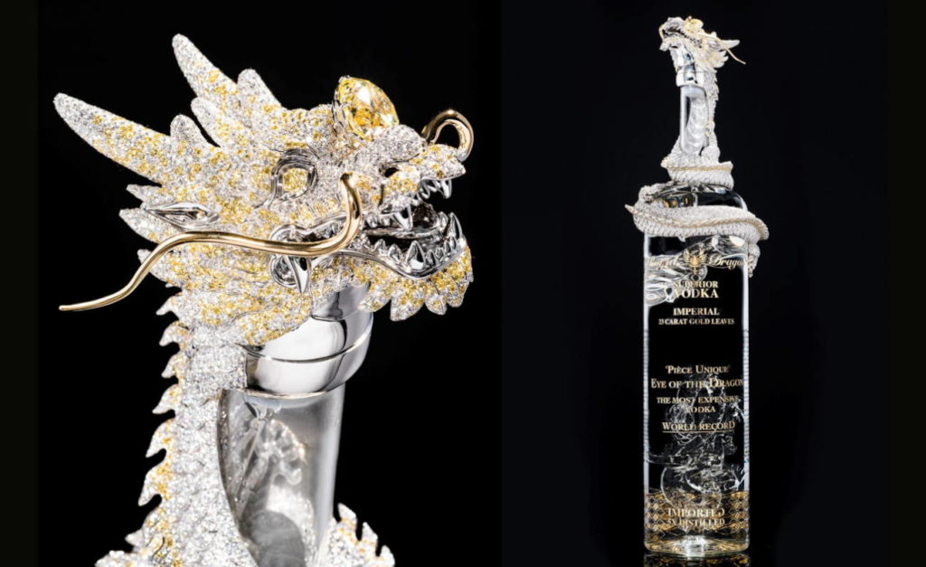 Unica nel suo genere la bottiglia di vodka Eye of the Dragon è tempestata di 15mila diamanti. Creata da Michel Warren e Scarselli Diamonds New York è realizzata in vetro soffiato a mano e rivestita da due chilogrammi di oro 18 carati. Sul collo si trovano un eccezionale diamante giallo da 50 carati e un drago d\'oro. Otto mesi di lavoro tra progetto e produzione per un valore di 5,5 milioni di dollari, quasi 5 milioni di euro. Per il Macallan M Imperial Whiskey, è stata coinvolta il band Lalique. Il risultato del lavoro dei maestri artigiani della celebre Maison di vetri e cristalli artistici è un particolare decanter, solo 4 copie esistenti, il più grande mai realizzato da Lalique e il maggiore mai usato da Macallan. Costo: 628mila dollari, ovvero 564mila euro.