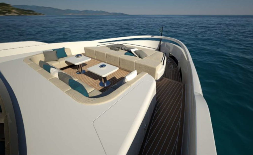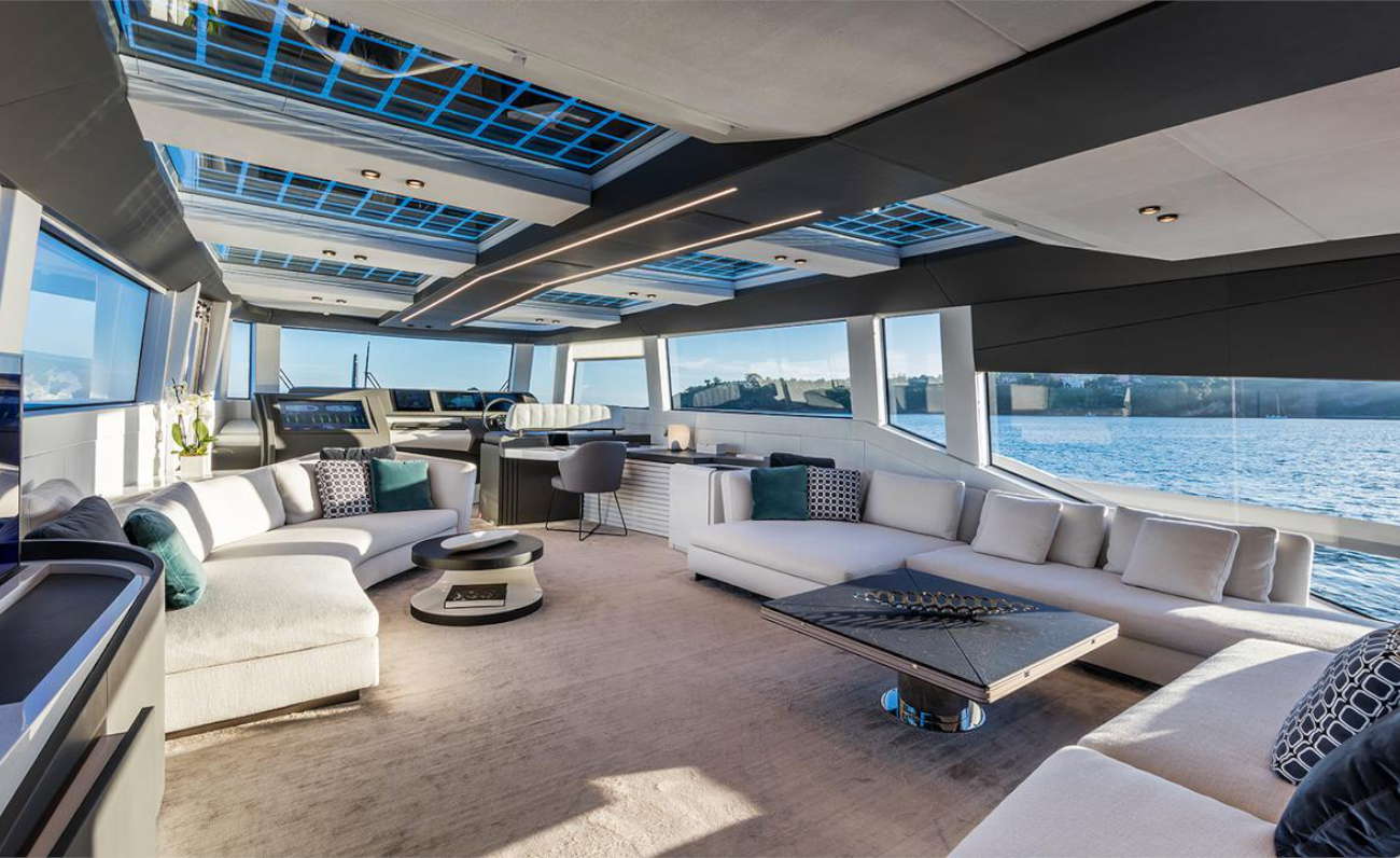 Le fiancate sono caratterizzate da una teoria di finestre scure senza interruzione da poppa a prua, che prolungano ulteriormente la prospettiva laterale mentre inside il layout comprende un appartamento armatoriale sul main deck con doppio bagno separato per lui e per lei, un ampio ufficio attrezzato, una zona dressing room e un doppio balcone apribile. Oltre a un ampio salone con sala da pranzo che si affaccia sul living ed enfatizza ulteriormente il senso vicinanza al grand bleu. Sul ponte superiore è presente una lounge vista mare e un\'area esterna open con divani, sedute e cuscinerie adibita a solarium oltre a una zona prodiera completa di idromassaggio.