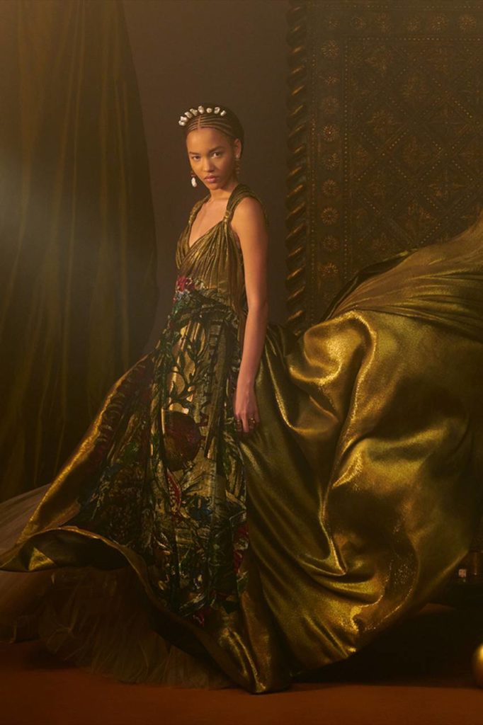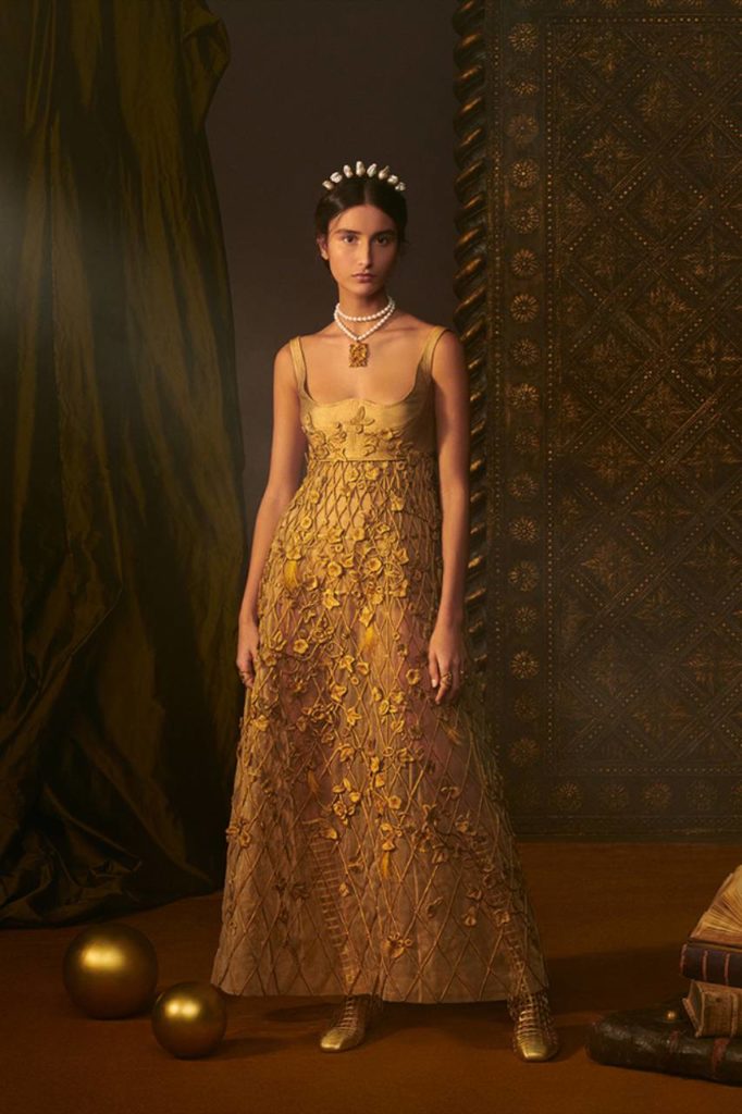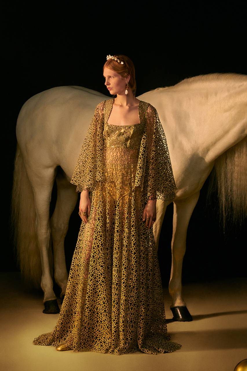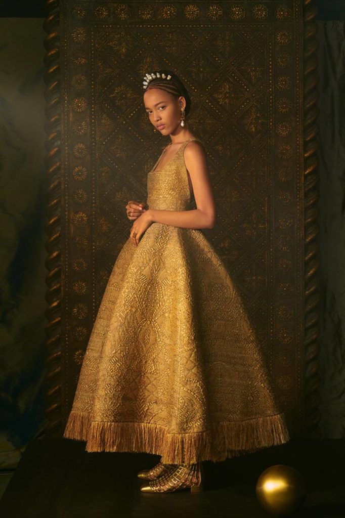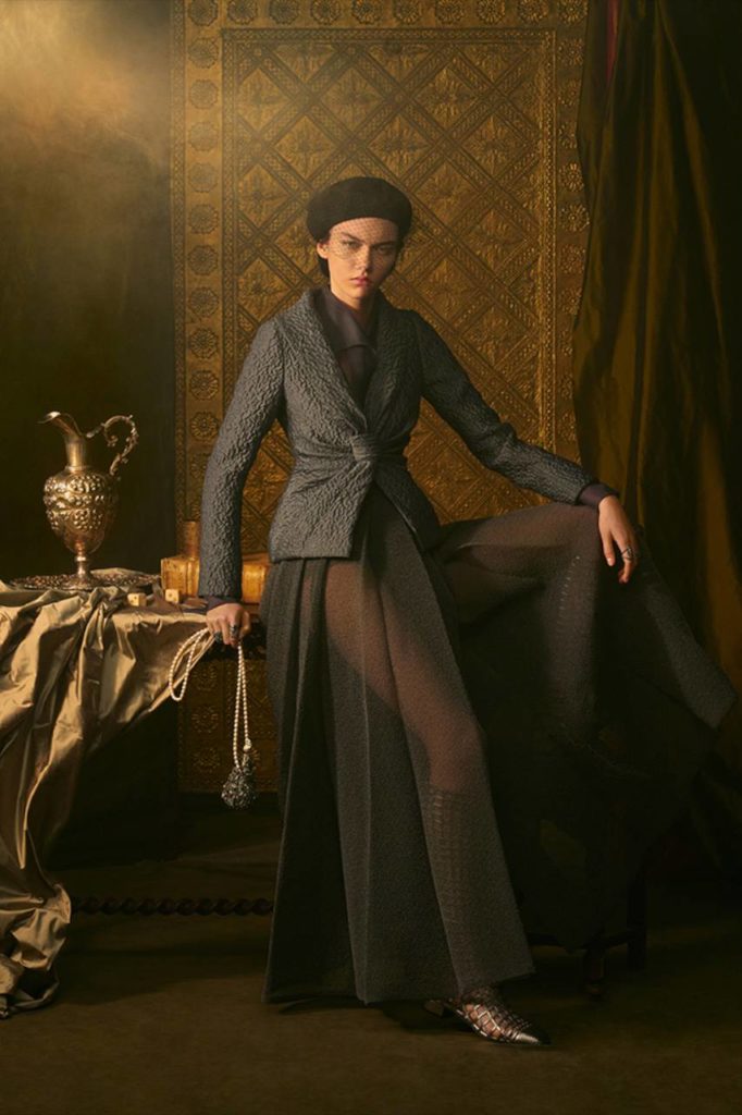 Il grigio Dior è declinato su tweed, cachemire, organze, che diventano abiti, camicie, gonne, pantaloni, mantelle. La giacca Bar in velluto nero esprime una nuova attitudine grazie a una speciale bombatura, e quale quintessenza della raffinatezza, l’oro punteggia le creazioni illuminandole con le sue delicate nuance, in particolare negli abbinamenti con lo shantung di seta. Anche l’iconico abito Miss Dior è riproposto in una splendida versione dorata.
