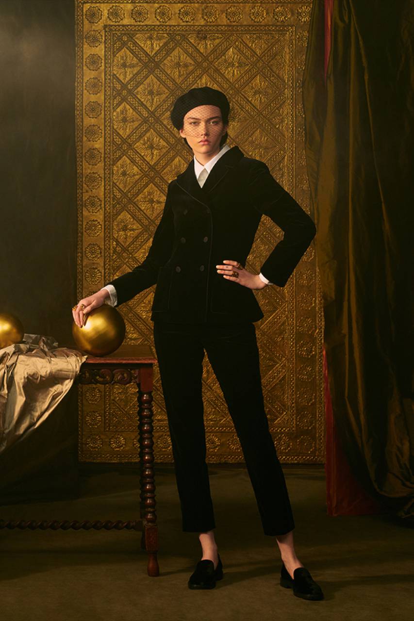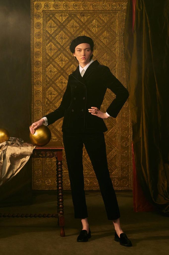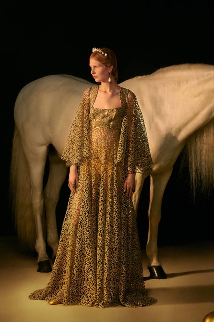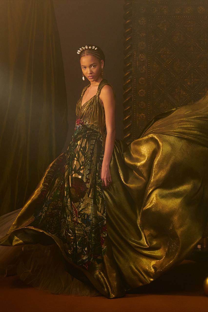 Il grigio Dior è declinato su tweed, cachemire, organze, che diventano abiti, camicie, gonne, pantaloni, mantelle. La giacca Bar in velluto nero esprime una nuova attitudine grazie a una speciale bombatura, e quale quintessenza della raffinatezza, l’oro punteggia le creazioni illuminandole con le sue delicate nuance, in particolare negli abbinamenti con lo shantung di seta. Anche l’iconico abito Miss Dior è riproposto in una splendida versione dorata.