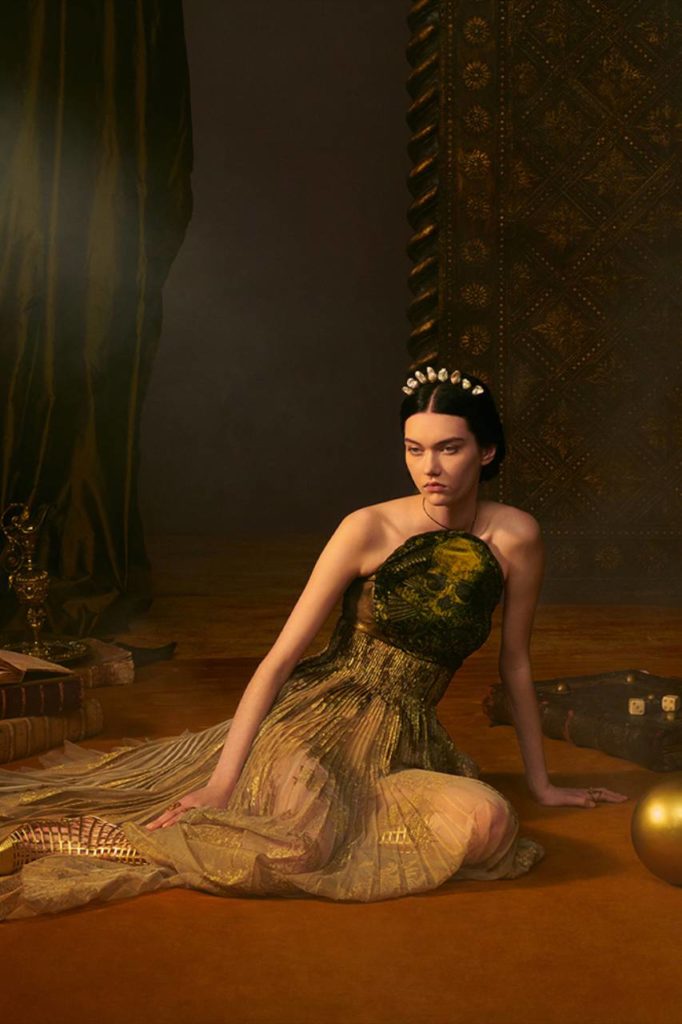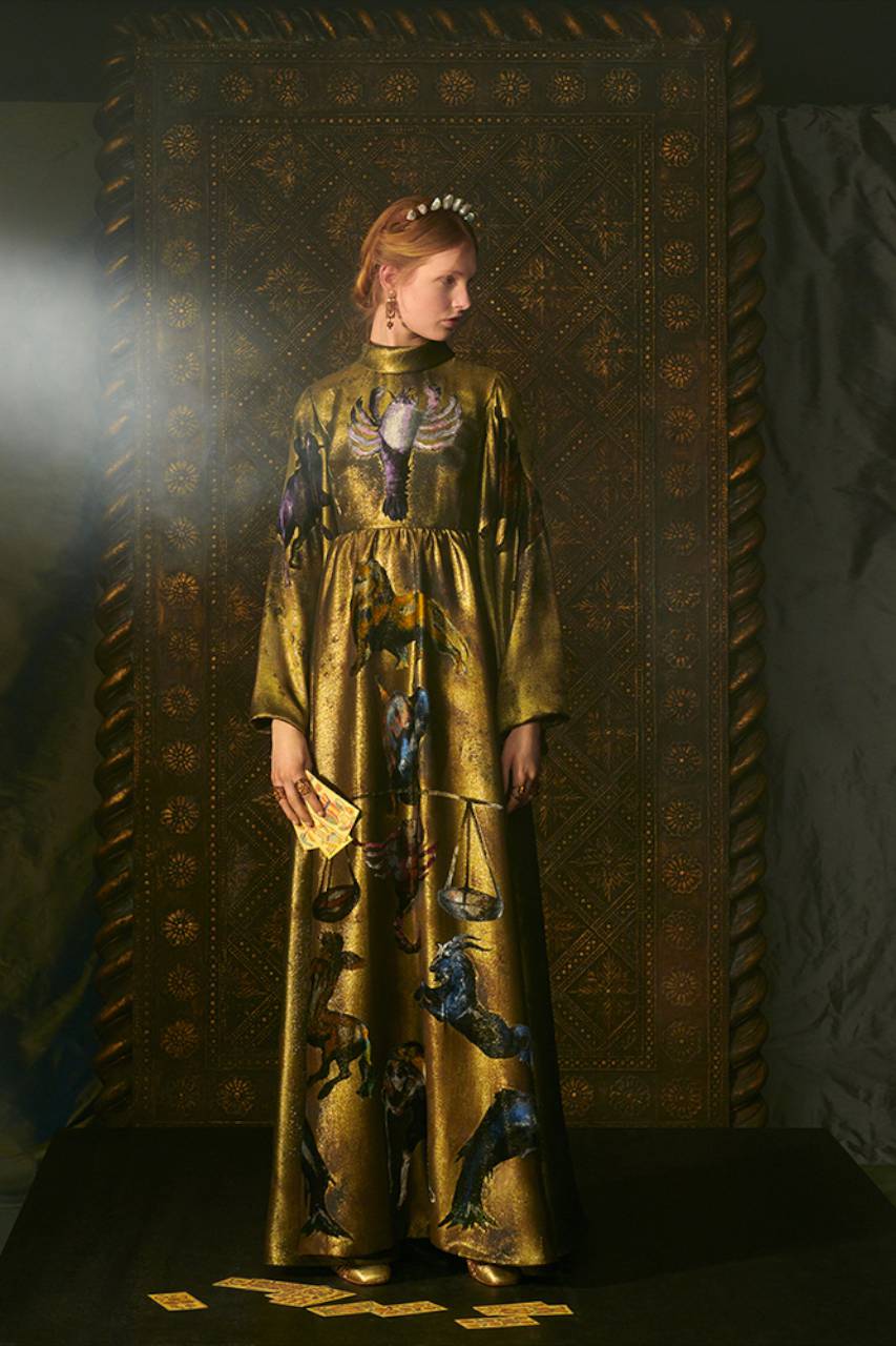 Il mondo delle arti divinatorie affascinava Monsieur Dior, che non ha mai nascosto la sua passione per l’ignoto, i segni del destino e gli amuleti. La attuale direttrice artistica della Maison, Maria Grazia Chiuri, in perfetta sintonia col suo fondatore ci invita a entrare nell’intrigante e incantevole mondo dei Tarocchi, e utilizza i suoi simboli per dare vita a una collezione haute couture sontuosa e densa di misteri.