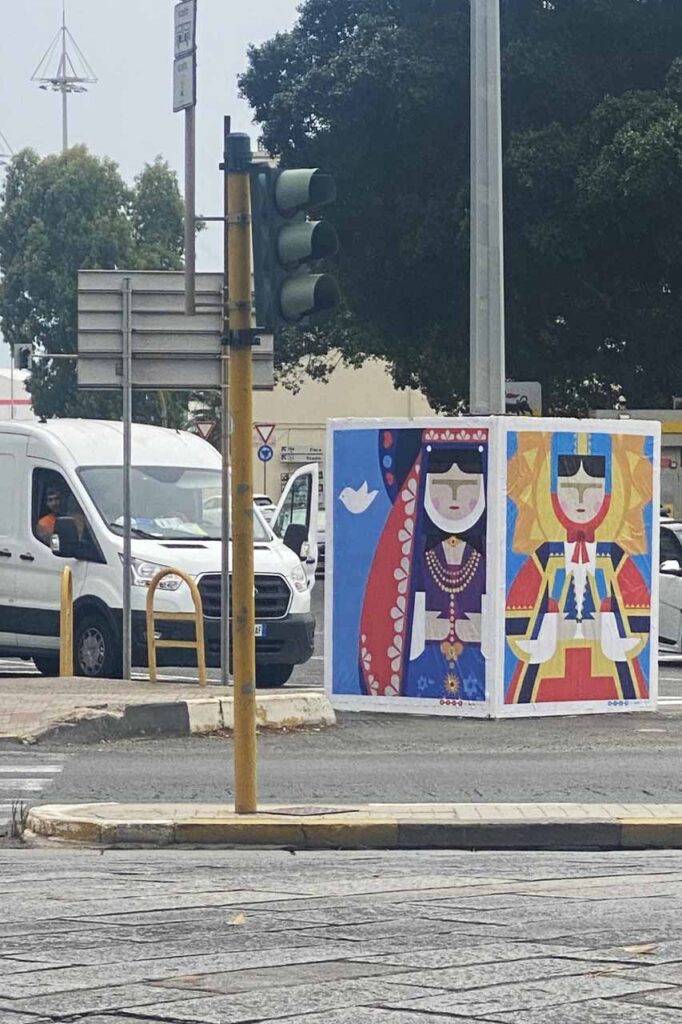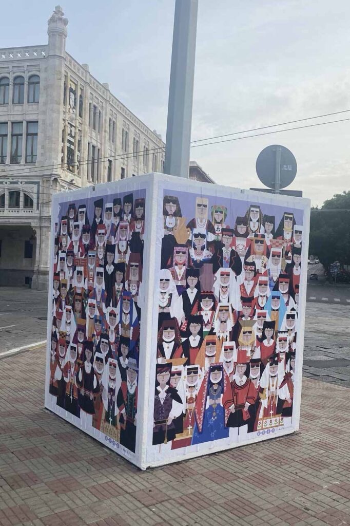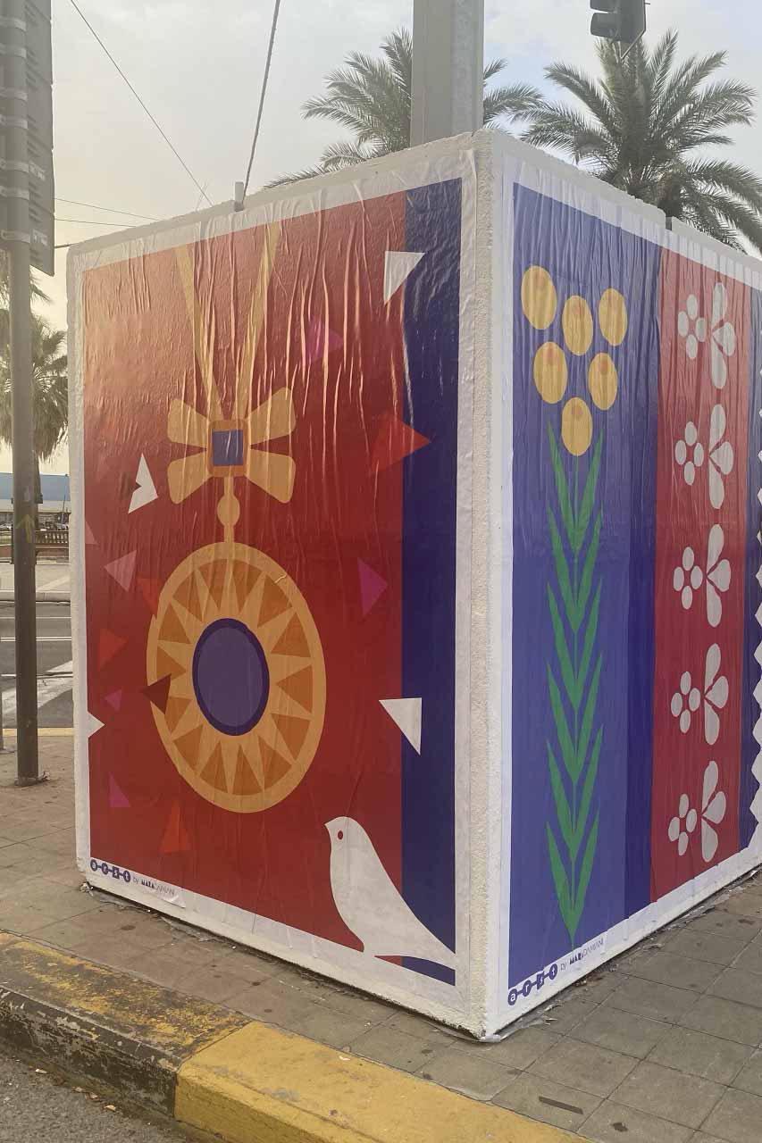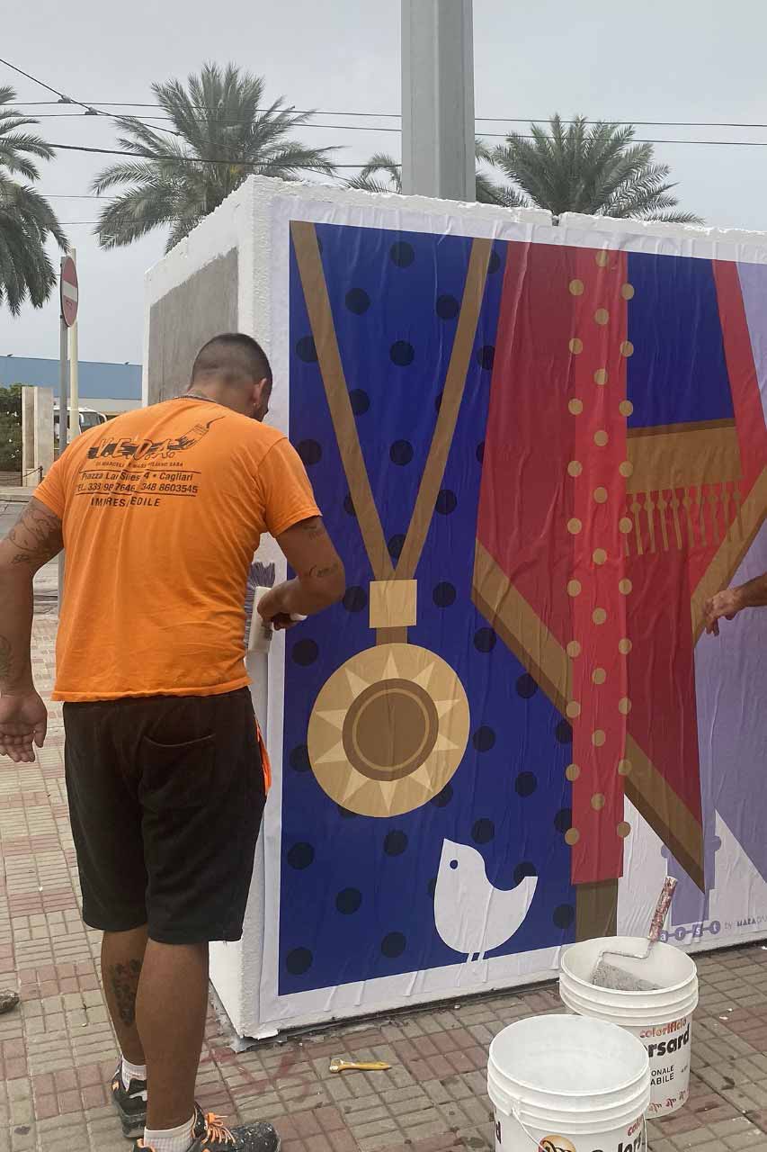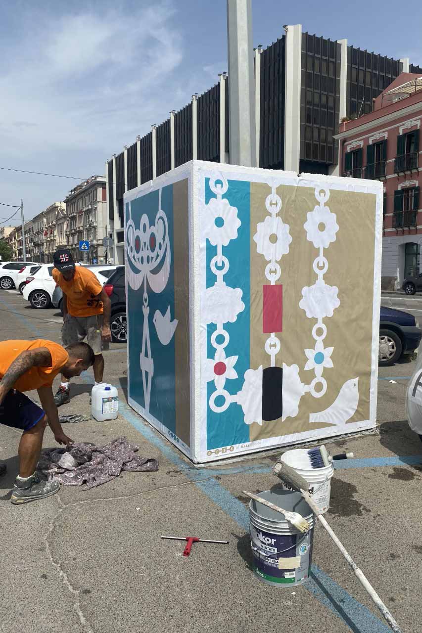 Mara Damiani designer e artista fa un’operazione di personalizzazione grafica su quattro dei cubi di cemento che ARST, azienda regionale sarda trasporti, ha disseminato per la città; sono enormi blocchi grigi, necessari agli interventi strutturali per i lavori della Metropolitana leggera che ora, ricoperti dalle colorate immagini di Mara Damiani, parlano di identità e di Sardegna nel gioioso linguaggio della grafica di chi si è formata all’Accademia Disney di Milano.