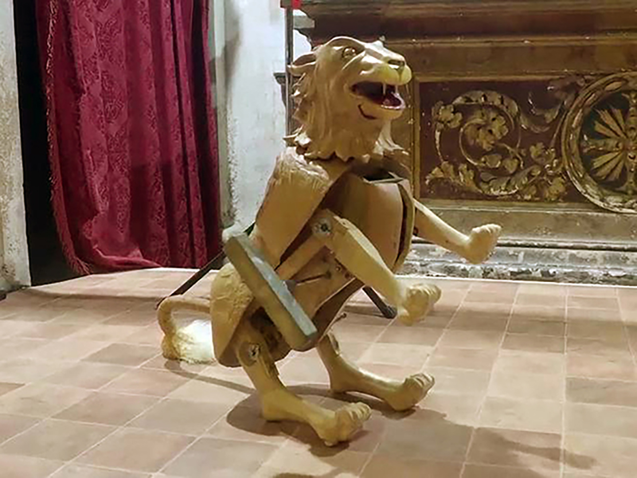 L’originale del leone, che era a grandezza naturale e ricoperto di pelle, è andato perduto, e quello di oggi gli restituisce nuova vita pur essendo realizzato nelle dimensioni di un cucciolo. Ne esistono due esemplari, uno agli Uffizi e uno presso Genus Bononiae. Assistere all’esibizione dell’automa è un’emozione fuori dal tempo. Luca Garai carica a molla l’automa, un sornione e fiero leone che fa quattro passi, si inchina, alza le zampe e mostra il petto dal quale escono i famosi gigli viola. Per quaranta secondi vi sentirete alla corte del Re di Francia.