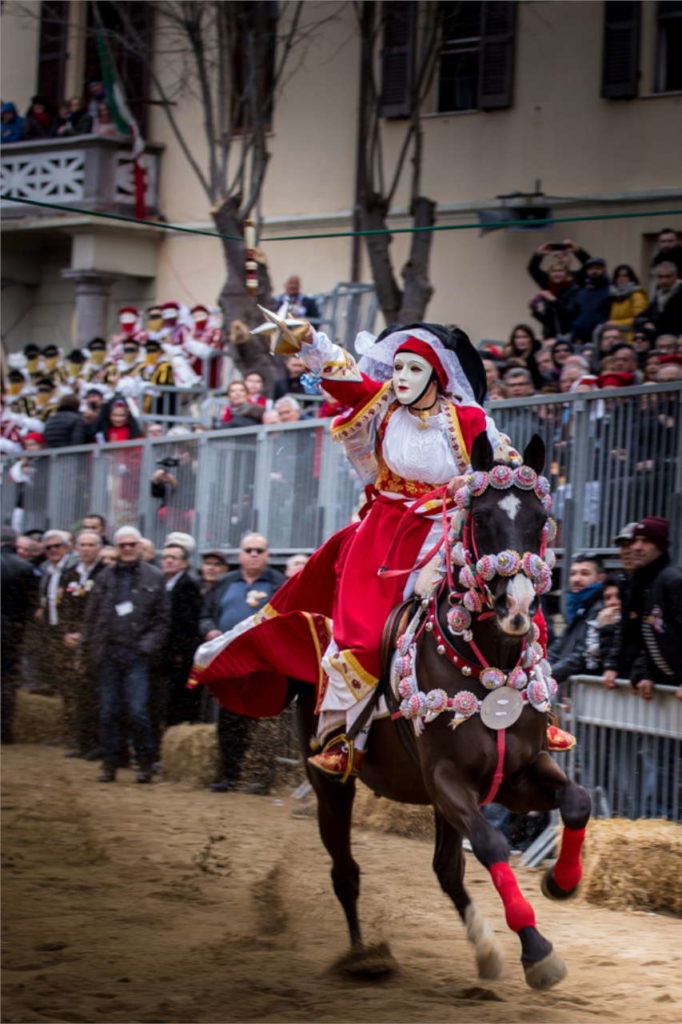 La Sartiglia di Oristano affonda le sue radici nei riti pagani legati alla fertilità e alla prosperità e nei successivi spettacoli equestri che venivano organizzati in onore dei sovrani e dei ricchi signori, in particolare dall\'età medievale in poi. I protagonisti sono i centoventi cavalieri che, al seguito de su componidori, tutti con una maschera bianca e un costume di foggia sardo-spagnola, si lanciano a tutta velocità lungo il tracciato con un obiettivo ben preciso: infilzare con la propria spada le stelle argentate sospese in aria. Le corse sono due: una la domenica e l\'altra il martedì grasso. Il primo giorno il progratonista è il Gremio dei Contadini, mentre 48 ore dopo è la volta del Gremio dei Falegnami.