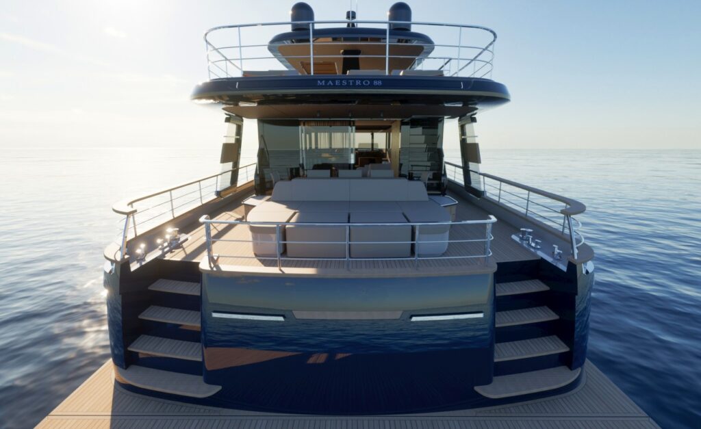 Con una lunghezza di 27 metri fuoritutto, Maestro 88 è un\'imbarcazione progettata per offrire maggior protezione e libertà di movimento a bordo. Il design è curato da Marco Casali di Too Design, ed è caratterizzato da linee eleganti che colpiscono subito l\'occhio, con diversi dettagli che lo rendono perfetto per un\'esperienza a tutto tondo con l’ambiente marino. Lo yacht presente un ampio pozzetto e un\'area lounge posizionata a prua, uno spazioso beach club ed è contornato da vetrate scorrevoli e finestrature a lato che permettono di far filtrare la luce e rendere ancora più luminoso l\'ambiente interno. Posizionati sul flybridge anche un angolo cucina con wet bar e spazi per rilassarsi. Il T-Top integra pannelli solari per il funzionamento degli impianti di bordo.