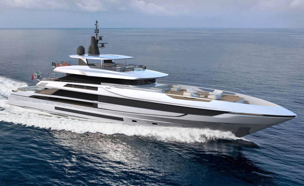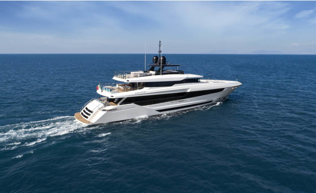 Disegnato ottimizzando spazi esterni ed interni e mantenendo il limite delle 500GT, si propone qualcosa di innovativo ed originale in questo segmento di mercato. Gli spazi esterni a disposizione degli ospiti sono notevoli. Un esempio interessante è il pozzetto di poppa che sembra il living di una villa: i divani sono racchiusi da un guscio in teak e formano un anello quadrato, leggermente ribassato rispetto ai passaggi laterali, così da ottenere una zona di privacy unica. Spostando il garage a prua, le dimensioni a disposizione del beach club diventano importanti, creando una piattaforma sul mare spaziosa e perfettamente attrezzata. La zona di prua è un’altra area ricca di intuizioni creative e soluzioni intelligenti. L’ampio pozzetto, lineare e spazioso, arredabile a piacere dall’Armatore, sovrasta il garage. Una volta varato il tender, la vasca contenitrice può essere riempita di acqua per ottenere una vera e propria piscina con nuoto controcorrente. Una seconda piscina jacuzzi si trova sul sundeck, vicino ad un tavolo dining per 12 persone protetto dal sole da un hard top a tutta larghezza e ad una zona relax. Ciò che rende davvero interessante questo modello è il layout che offre diverse opportunità di configurazione, come ad esempio la possibilità di avere una sesta cabina. Sta davvero all’Armatore scegliere come intende vivere a bordo. (Fabio Schiavo)